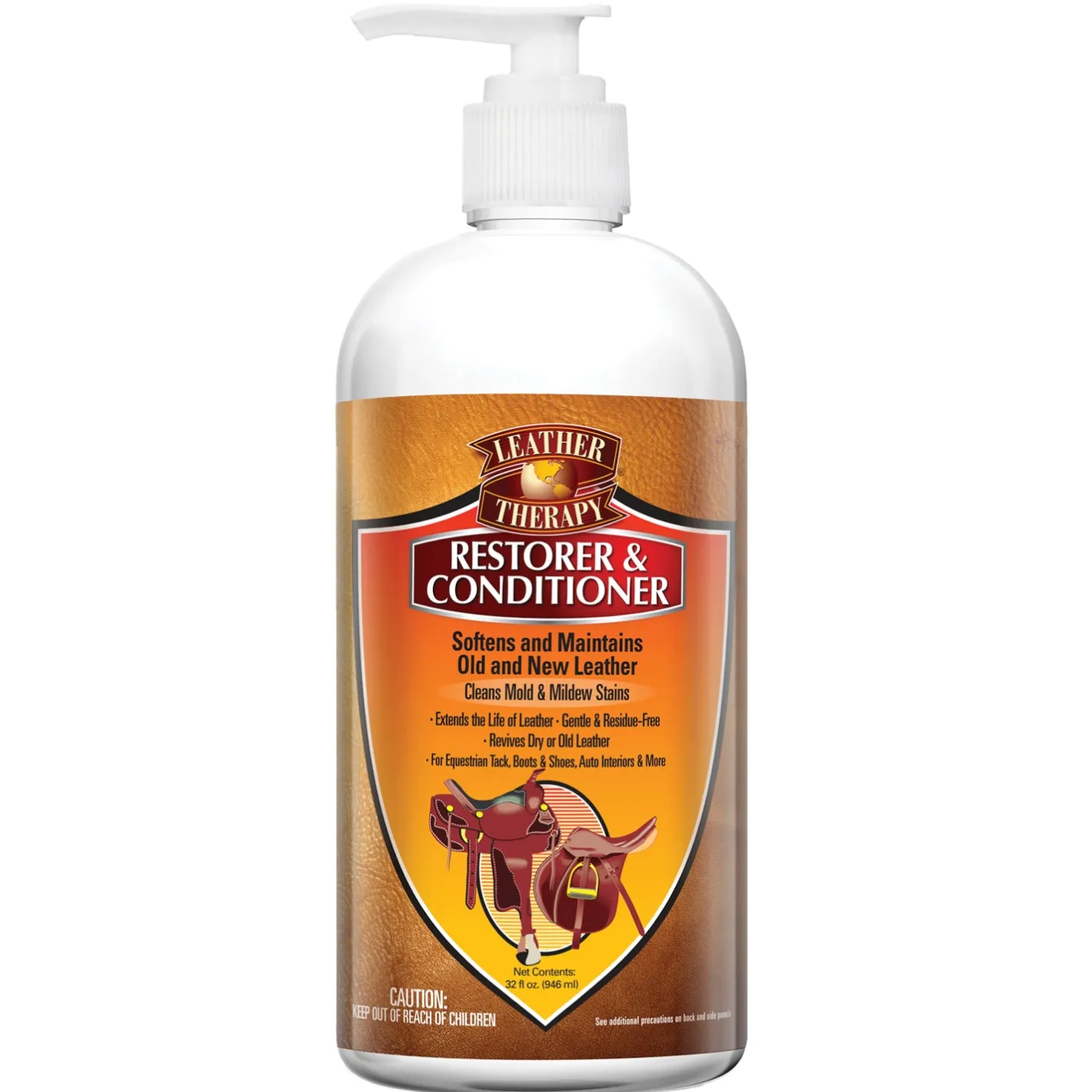 Leather Therapy® Restorer & Conditioner makes all your leather look and feel great. It easily removes mold and mildew from old leather and shortens the break-in time of new leather. This leather conditioner helps makes your leather soft, supple and strong without leaving behind any sticky or greasy residue. Formulated to condition from the inside out, it protects leather from life-shortening enemies such as sun, wind, moisture and more. Tests show a significant increase in leather tensile strength after using this conditioner. Environmentally-friendly and biodegradable. 32 ounces.