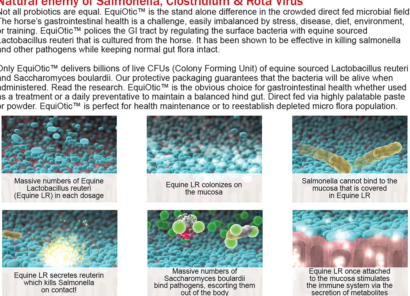 - Delivers a source of live equine cultured bacteria (Equine Lactobacillus reuteri)