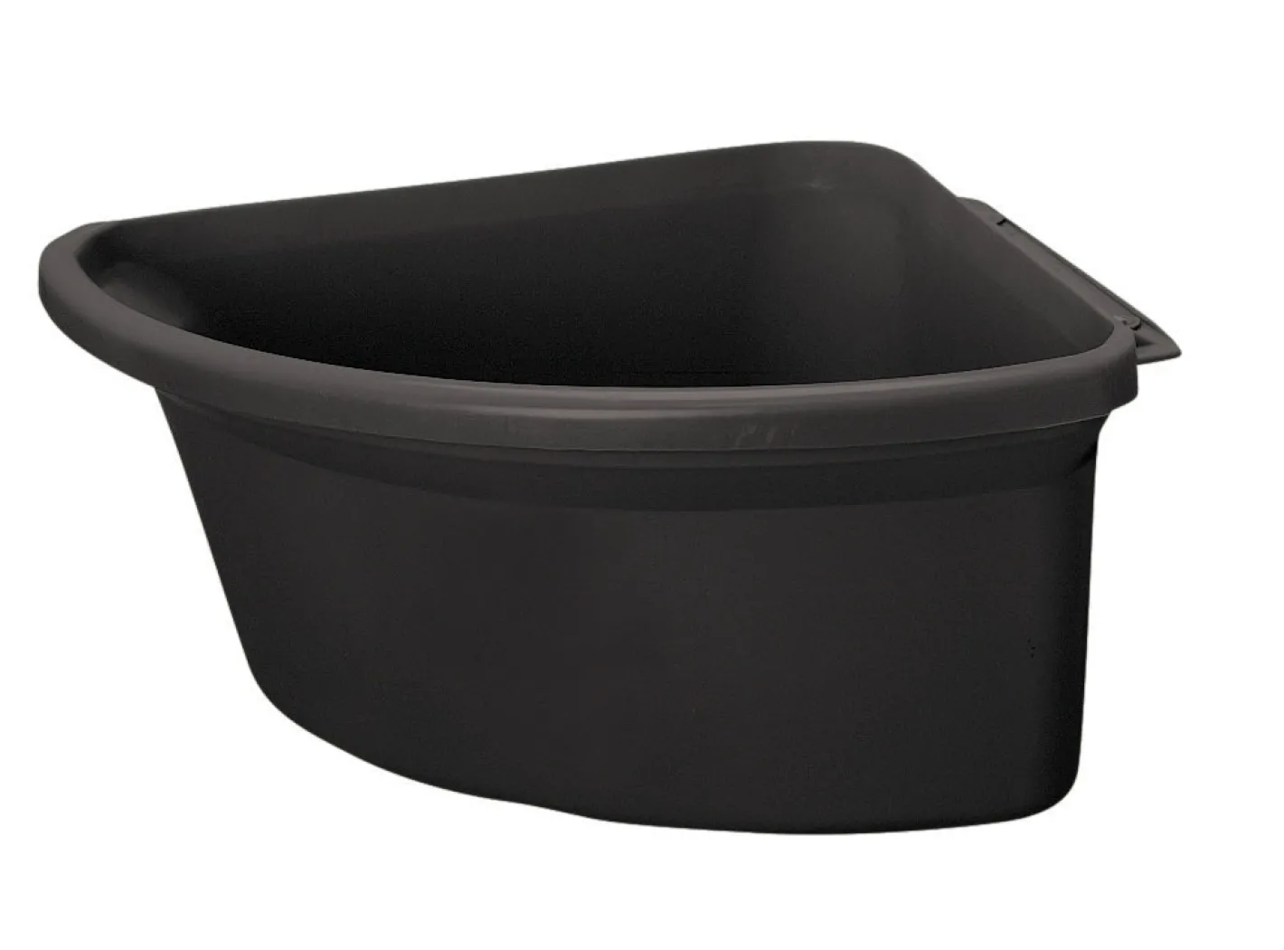The Fortiflex® Corner Feeder has a 24-quart (6 gallon) capacity. One-piece, crack-resistant construction stands up to life with horses. Offset front lip prevents spills. Fastens to walls with bolts or double-end snaps (not included). 2-piece brass eyelets.