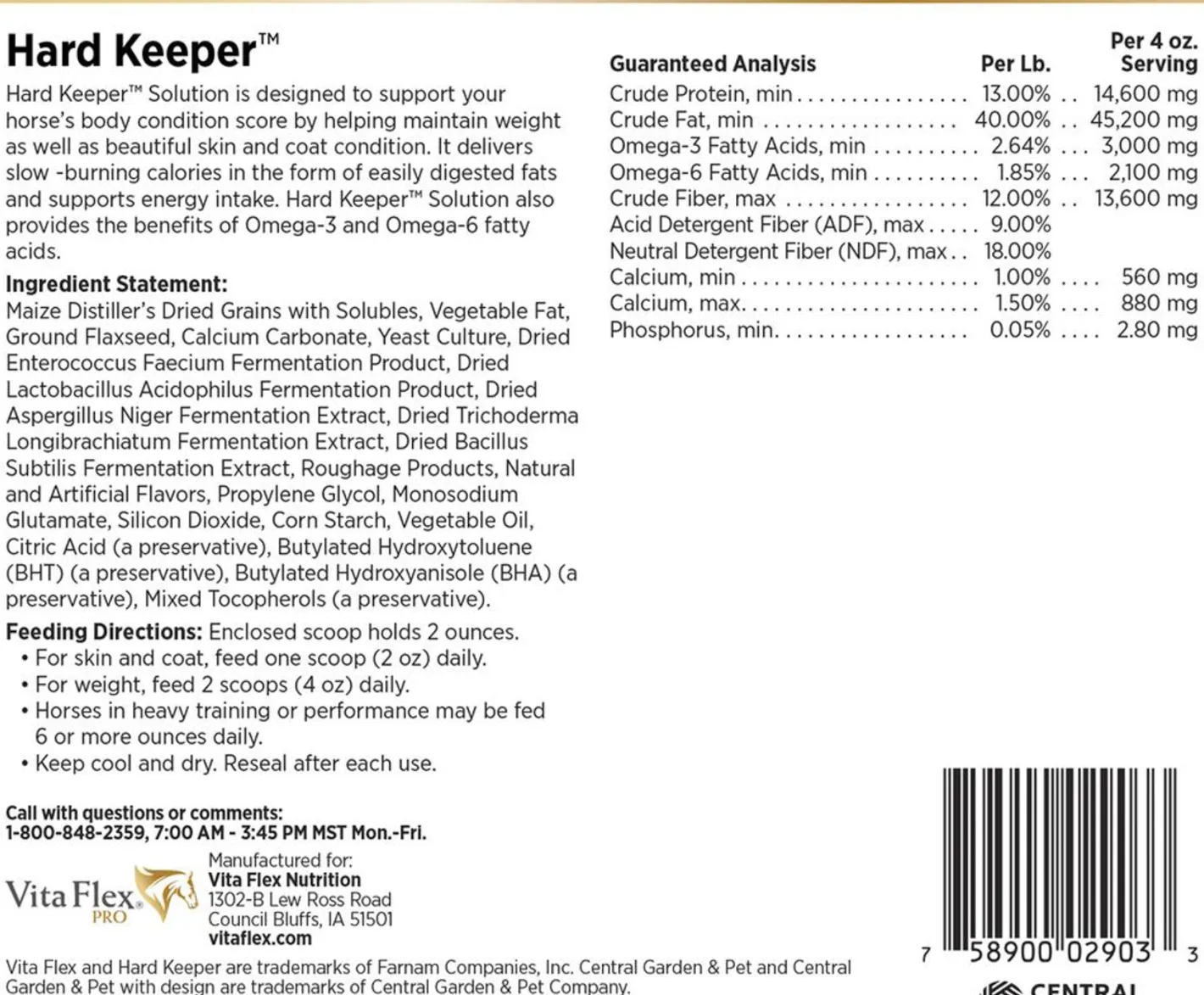 Vita Flex® Pro Hard Keeper™ Solution is designed to help support your horse’s body condition score. It helps maintain weight and supports beautiful skin and coat condition. Hard Keeper Solution delivers slow-burning calories in the form of easily digested fats and supports energy intake. It also provides the benefits of omega-3 and omega-6 fatty acids.
