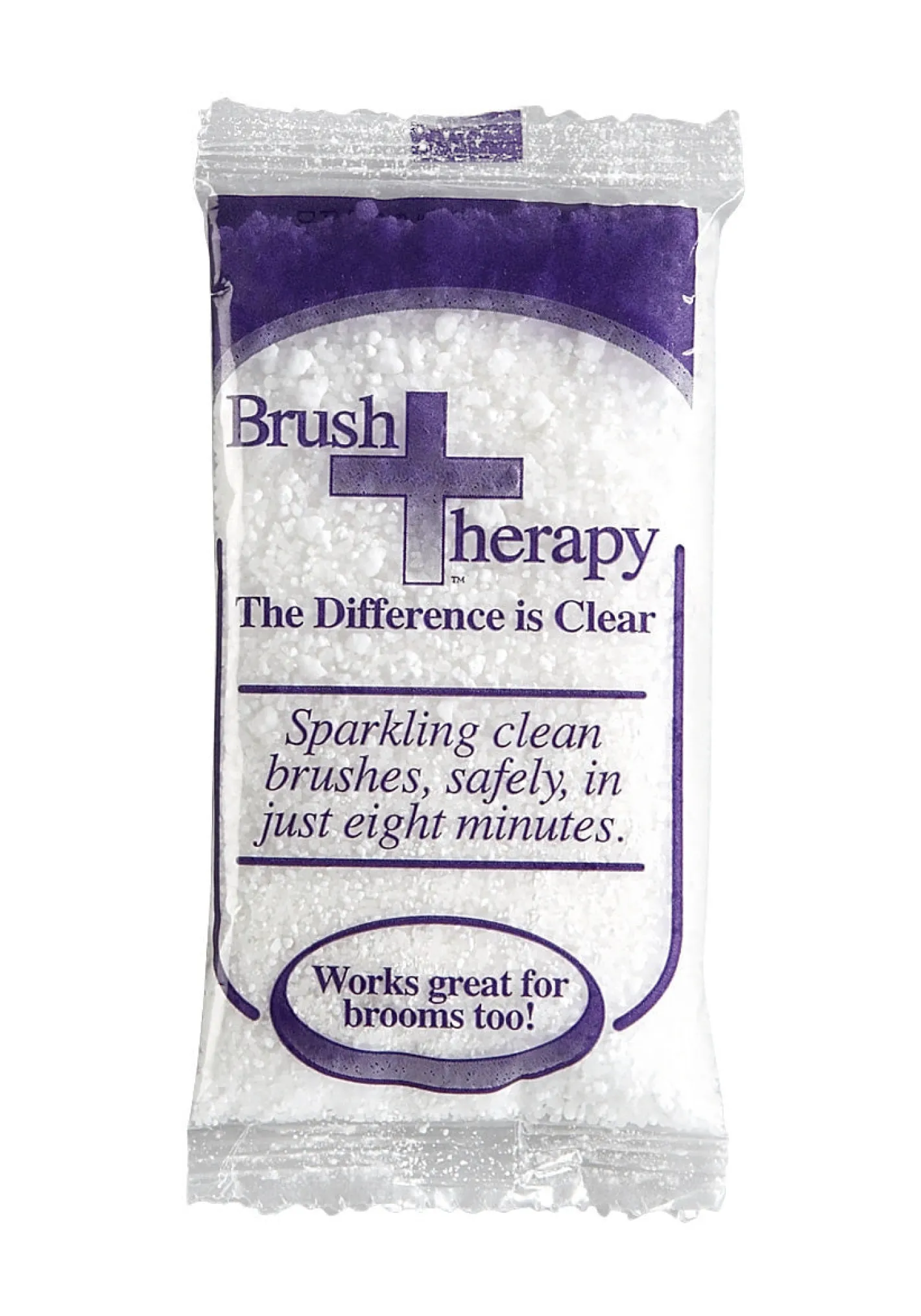Brush Therapy gives you sparkling clean grooming brushes in just minutes and with no effort! Just pour a gallon of warm water over your brushes, add a packet of Brush Therapy, and watch as the effervescent action lifts dirt, grime and bacteria from the bristles. Trapped hair combs out easily. Soak for eight minutes, and the solution rinses away cleanly and quickly. Your brushes are left in sanitary condition for top horse care. May be used on natural and synthetic bristles. Works great on brooms, too!