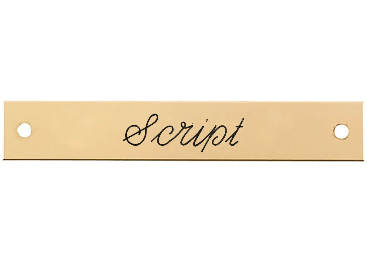 The Rectangular Dog Collar Plate in brass is a classic way to customize your dog′s collar or add contact information should your pup stray. Choose Block, Old English, Roman or Script letters, then enter up to two lines of text to be engraved. Predrilled 5/32″ holes fit rivets (included) for attaching the plate to a leather collar. Personalized items are not returnable.