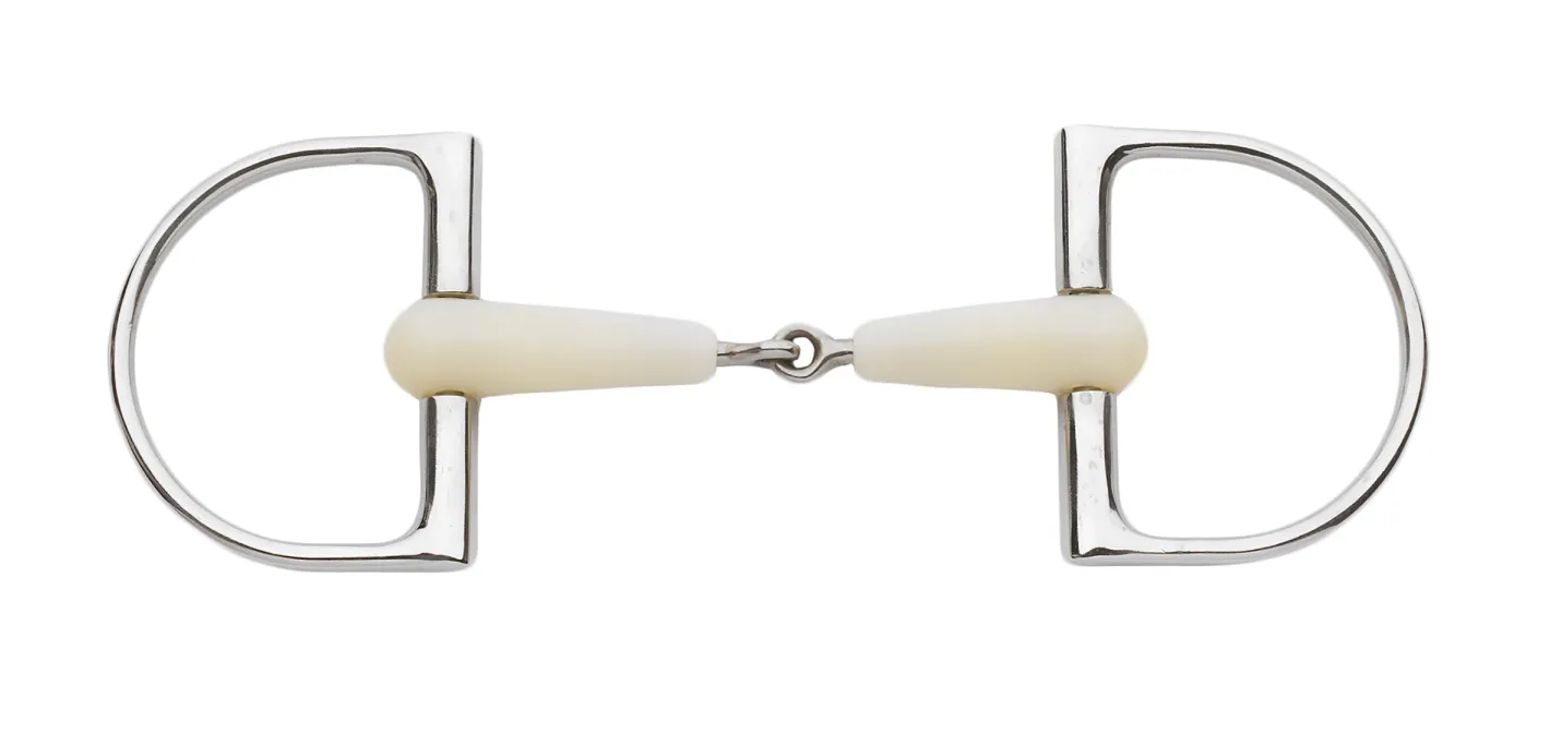 From Happy Mouth Bits®, the Jointed King D-Ring Pro Snaffle Bit has a mouth that’s covered with a soft, flexible, yet extremely durable, apple-scented plastic to encourage acceptance and softness. The core and rings are stainless steel. The ring design provides slight lateral guidance and helps prevent the bit from sliding sideways in the horse’s mouth.