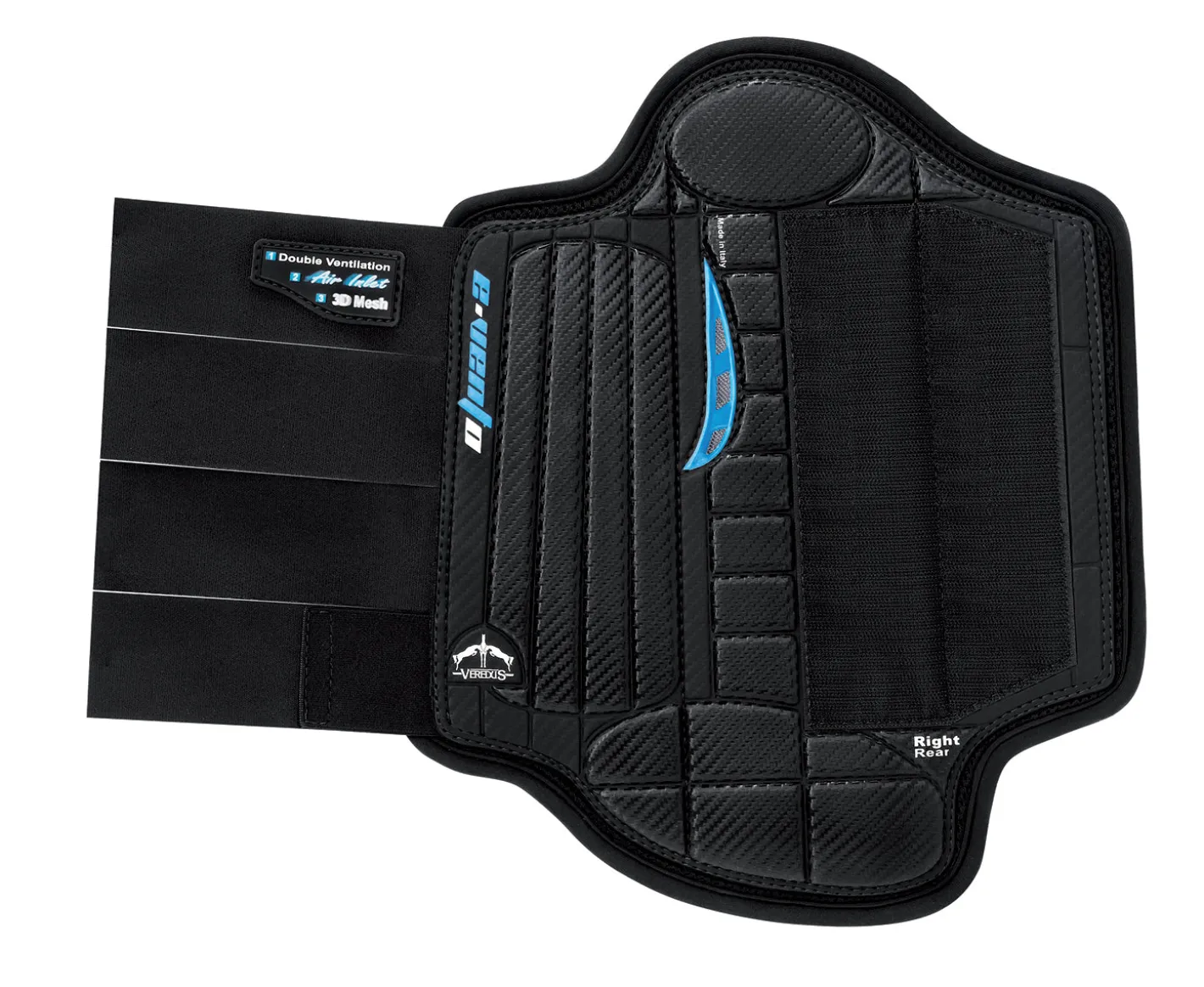 Designed specifically for eventers, Veredus® Nero E-Vento Hind Cross Country Boots offer 360° of leg protection. Double-ventilated through 3D mesh ducted fabric to keep the horse’s legs cool, these eventing boots feature micro-perforated AEROX neoprene construction. They help provide protection in all terrains, and they don’t absorb water. Despite offering extremely robust protection, E-Vento boots are lightweight to allow the horse optimal freedom of movement and flexibility. Pads of polyurethane foam help reduce shock felt during high impact. Sleek outer shells offer a professional look, while sturdy hook-and-loop closures keep them secure.