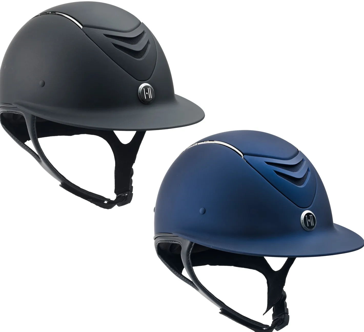The One K™ Defender AVANCE Wide Brim Chrome Stripe Riding Helmet** combines all of the features of the original One K Defender with the addition of a wide brim to offer additional coverage from the sun’s damaging rays. Two side, two front, one back and two center stripe vents for airflow are covered in stainless steel mesh. The comfort padded harness has a synthetic suede lining, hook-and-loop adjustment and Fastex buckle.