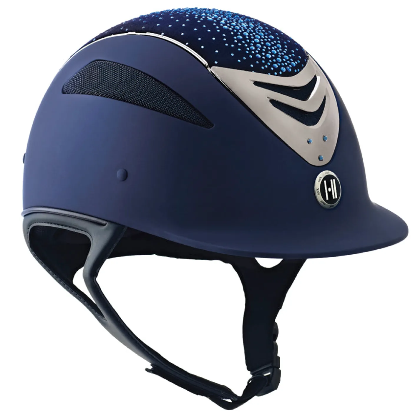 The One K™ Defender Celestial Helmet** adds an eye-catching sparkling rhinestone top, chrome stripes and vent to the popular One K Defender Helmet. The unique stones have an iridescent sheen that pick up light and become quite colorful.