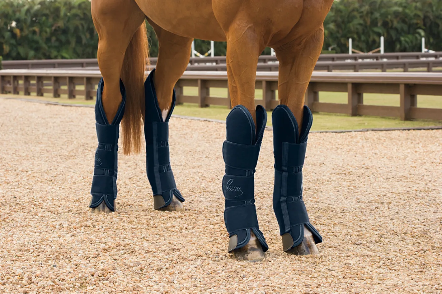 Made from ballistic weave nylon, Pessoa Shipping Boots have a contour shape, hoof protectors and large VELCRO® brand closures for comfort and protection. Pony size front 17 1/2″H, hind 22″H. Horse size front 21″H, hind 26 1/2″H.