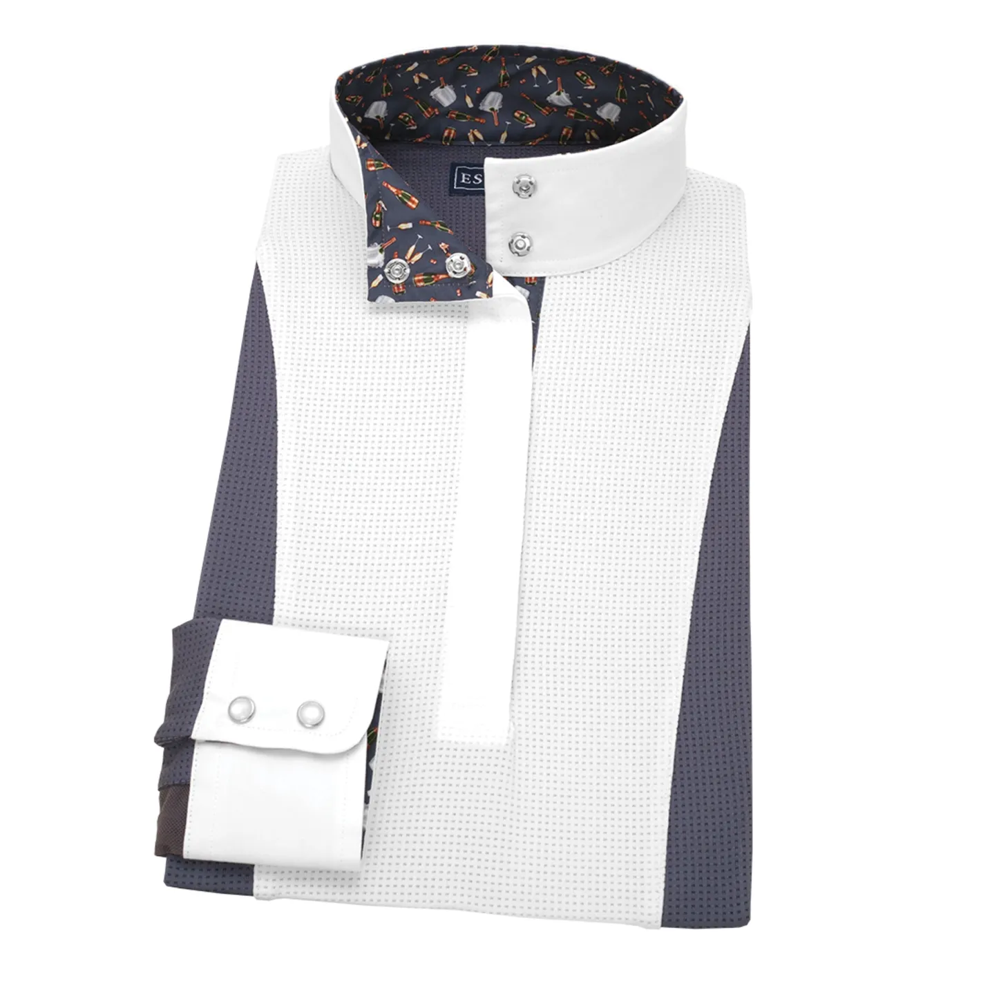 This pullover show shirt is naturally comfortable. A tapered fit ensures a smooth look under a show jacket. Mesh under-sleeve panels promote airflow. A white, full-length panel front with crisp white show collar partners with a solid color on the sides and back for a flattering look. Interior trim adds extra style.