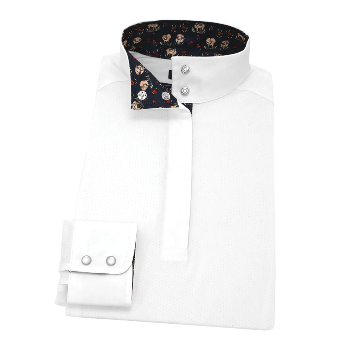 Back darts create a tapered fit through the body that lets this shirt fit smoothly under a show coat. Long shirttails keep it tucked as you ride. Finished with interior trim at the snap wrap collar and snap cuffs, with an embroidered logo on the lower front.