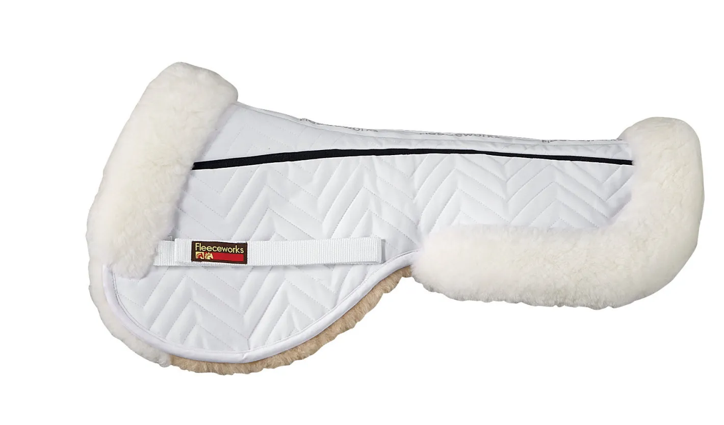 Fleeceworks™ FXK Technology Classic Half Pads reduce saddle pressure for your horse’s comfort. Cross elastic panels along the topline eliminate pressure on the horse’s spine and withers. Merino sheepskin provides ideal bulk/benefit ratio and moisture management. With rolled edge.