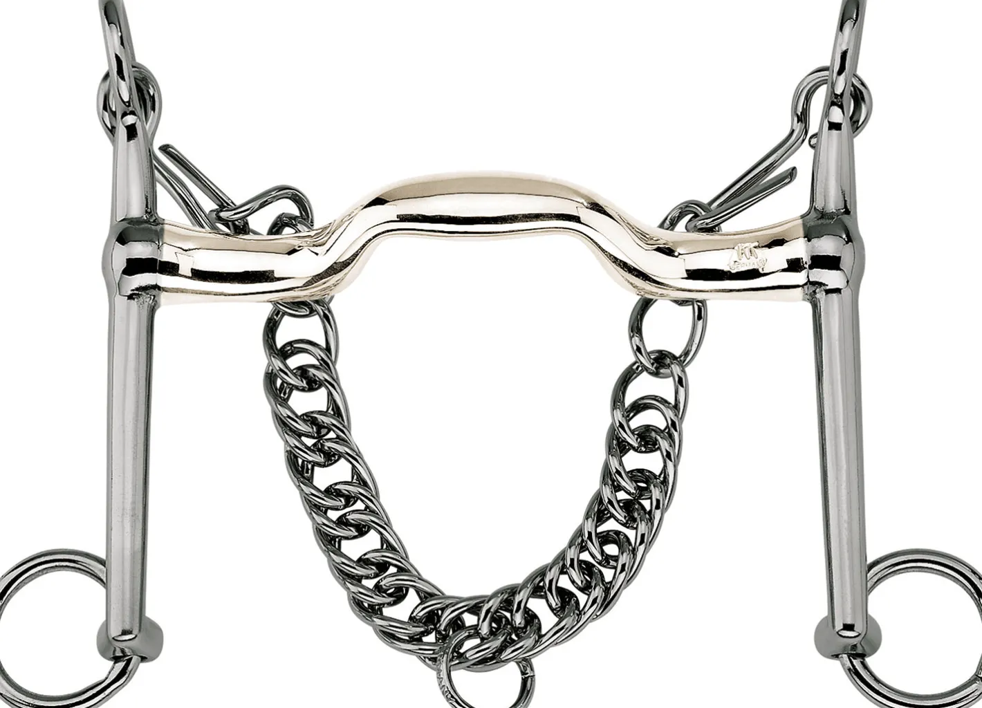 The Herm Sprenger KK Conrad Sensogan® Weymouth Bit features a port that’s angled forward 45° to allow for palate clearance. The 18mm mouthpiece is made of innovative Sensogan metal. As a result of ongoing research and development, experts at Herm Sprenger created Sensogan to offer all the benefits of Aurigan®, yet retain its discreet and elegant silver color much longer.