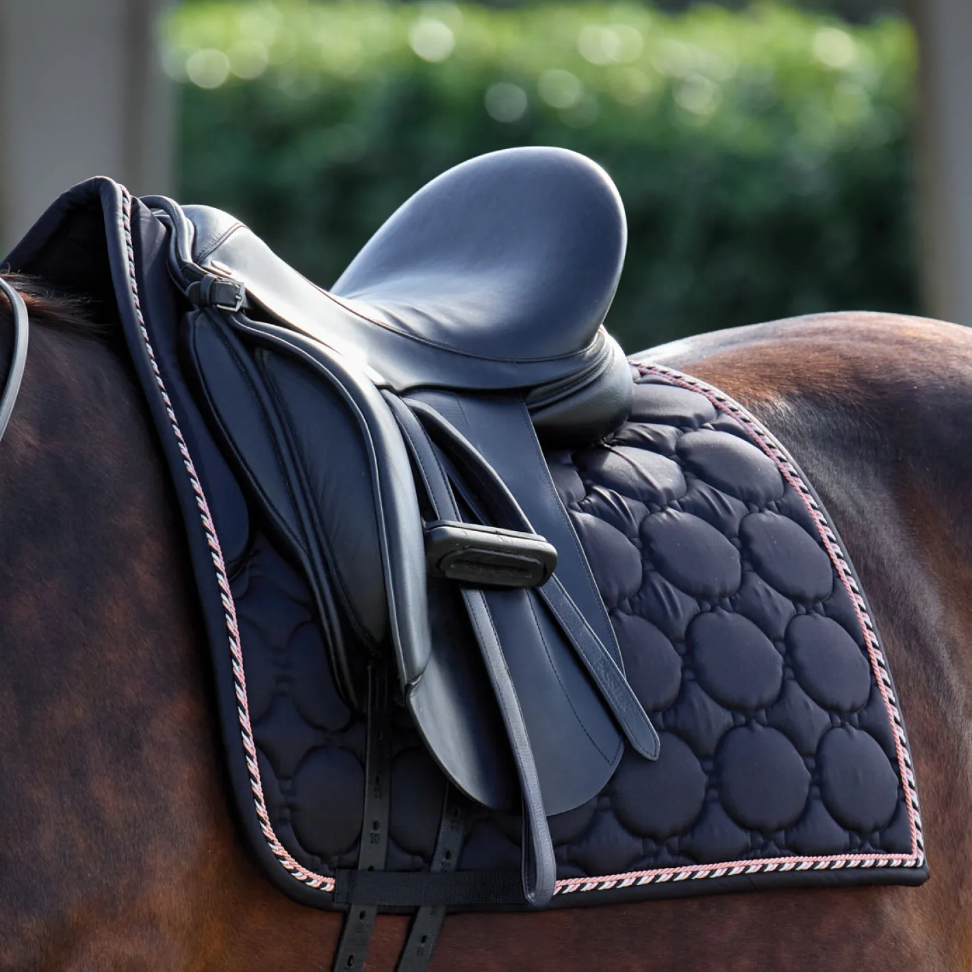 The stylish poly-satin top in classic colors is quilted over poly fill with foam for cushioning. A soft underside of bamboo-blend fabric transports sweat away from your horse, provides antibacterial properties and dries quickly.