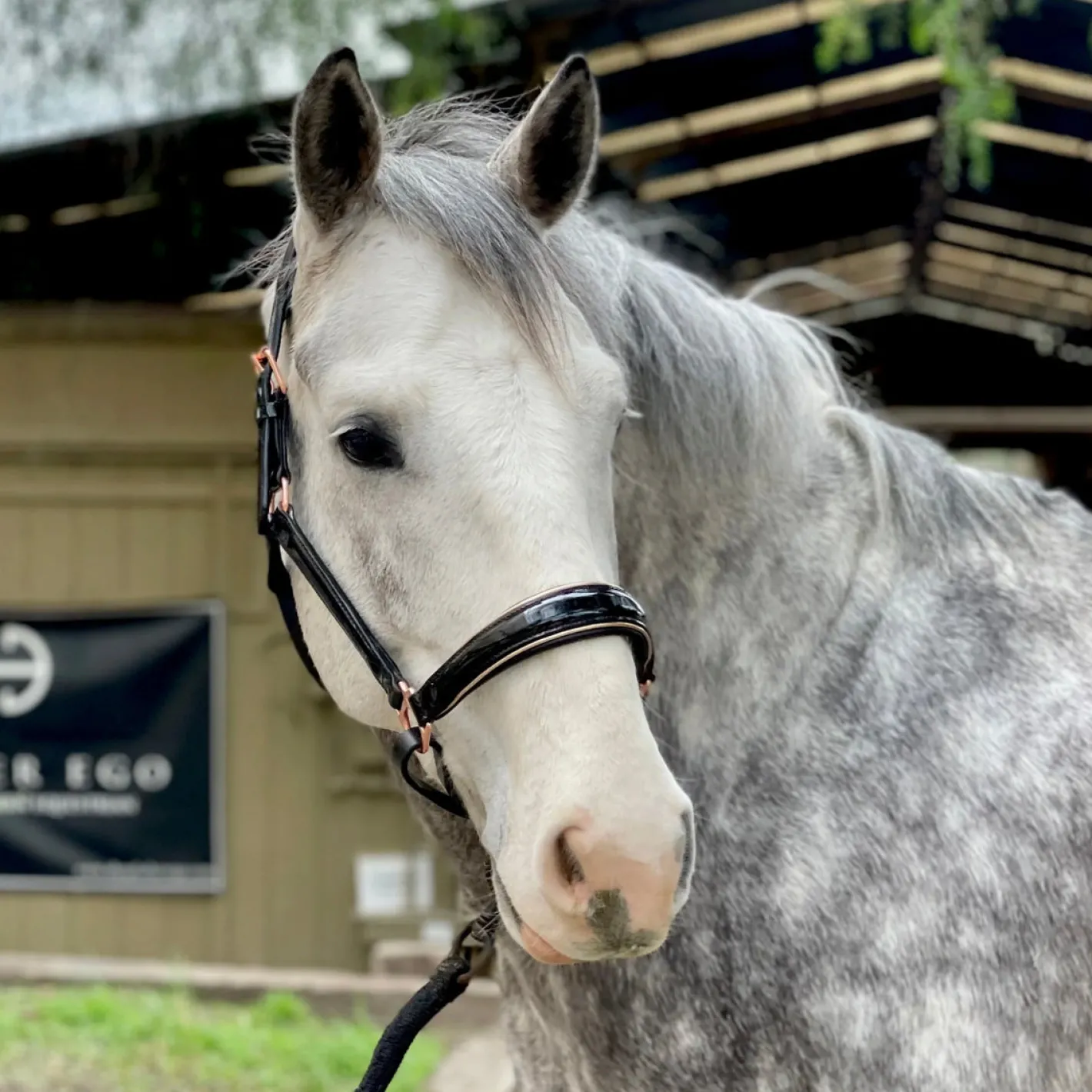Classic, subtle and sophisticated are all embodied in The Halter Ego® Catalonia Halter. Gorgeous metallic bronze patent leather, plush cafe-au-lait padding on the noseband and crownpiece. Beautifully highlighted with a warm cream patent piping on the noseband and golden brass hardware. Thick padded noseband and crown make this comfortable and perfect for daily use.