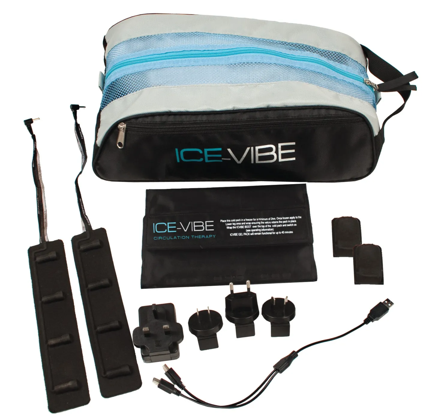 Each Pack Contains: 2 ICE -VIBE Boots, 2 cold packs, 2 vibrating panels, 2 batteries, 1 battery charger & 3 adapters for universal use. Rechargeable batteries with spare parts sold separately (Europe only).