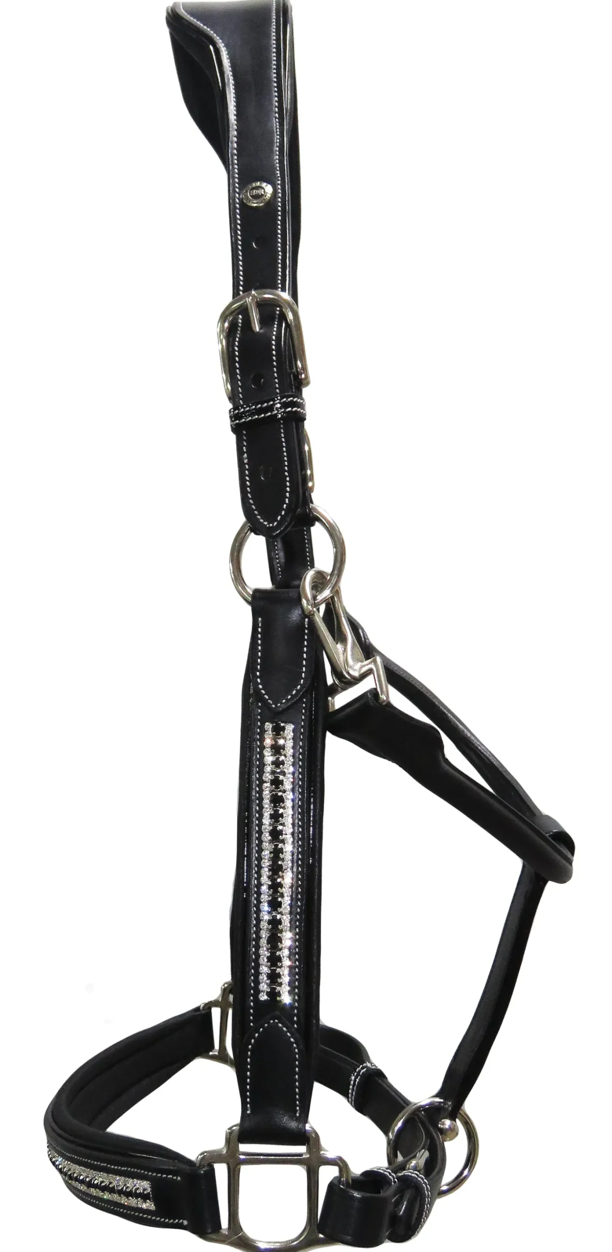 The Padded Jewel Halter by Henri de Rivel shows off your sense of fashionable style. Made of soft, high-quality leather, this eye-catching halter features three rows of crystals on the nose and cheeks accented by patent leather piping. Luxuriously padded for horse comfort, it has a two-buckle crown, adjustable chin and rolled throat with snap closure. Fitted with long-wearing stainless steel hardware throughout.