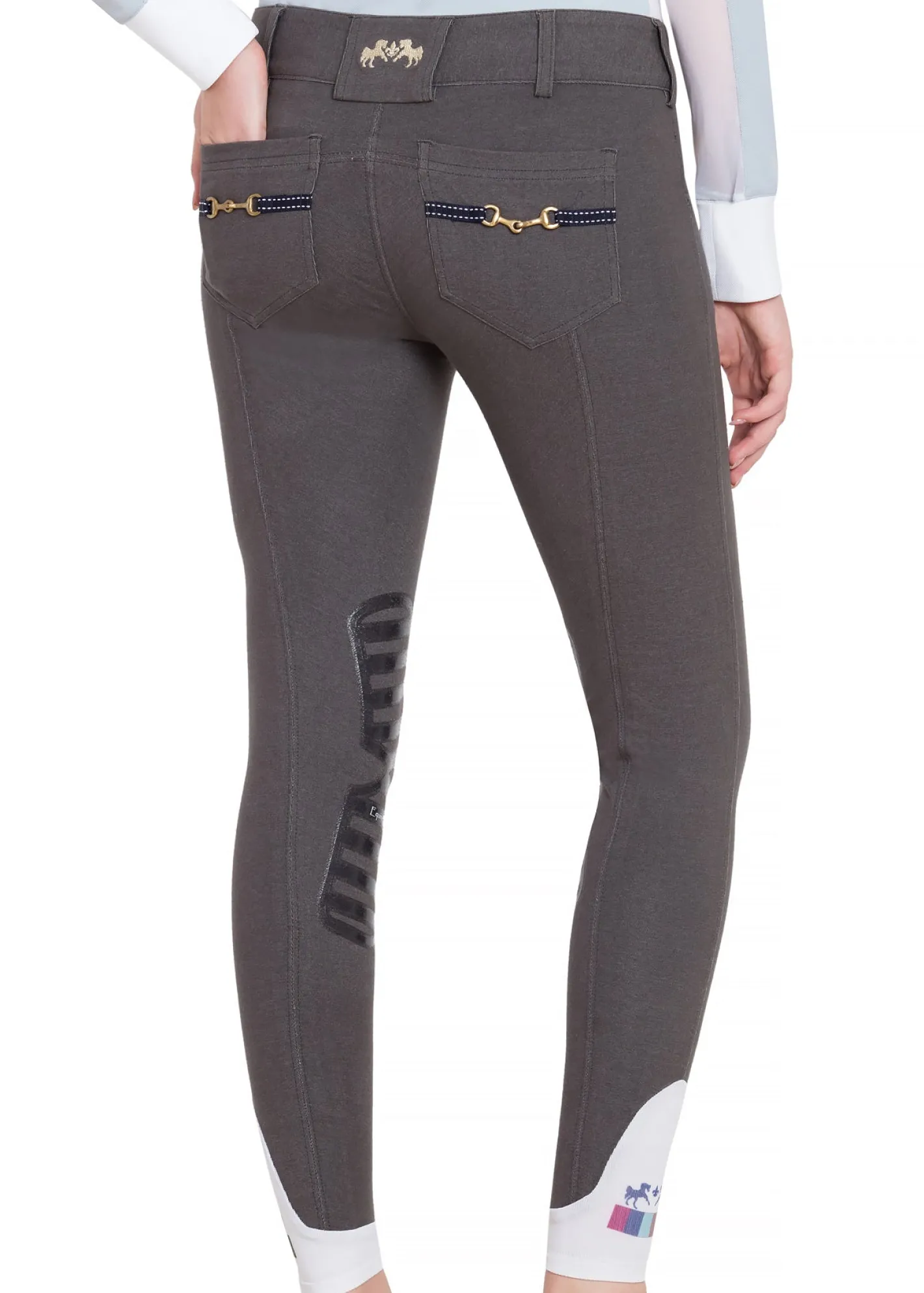 Additional aspects include silicone knee patches for extra grip and contoured sock bottoms to decrease bunching under tall boots. Eye-catching bit details on the back pockets look great from stable to street and are placed to avoid discomfort in the saddle. Perfect for schooling days, this breech is sure to be a favorite for comfort, feel and function.