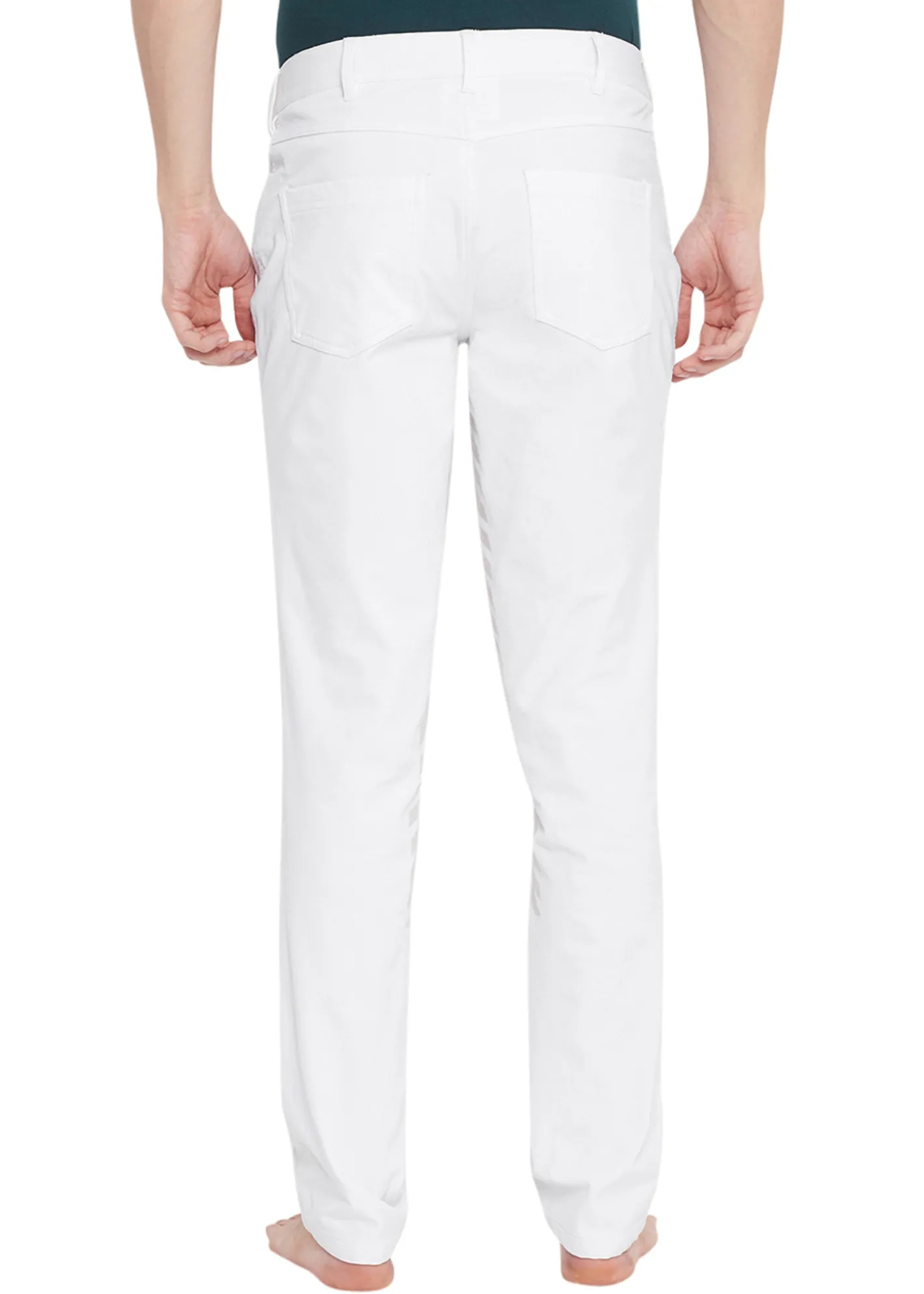 - Front-zip jeans styling.
