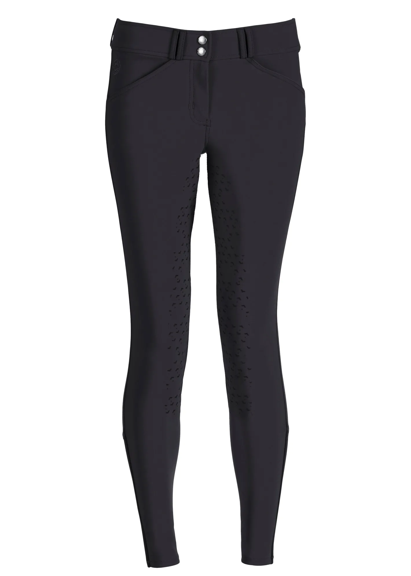 Single-layer, high-stretch calf panels provide a custom fit, eliminate bulk inside boots and allow easy on/off. Front slash pockets and functional back pockets are made of low-profile stretch material for a no-show appearance on the outside and enhanced comfort on the inside. The silicone print full seat features a stylish equestrian design that provides flexible grip.