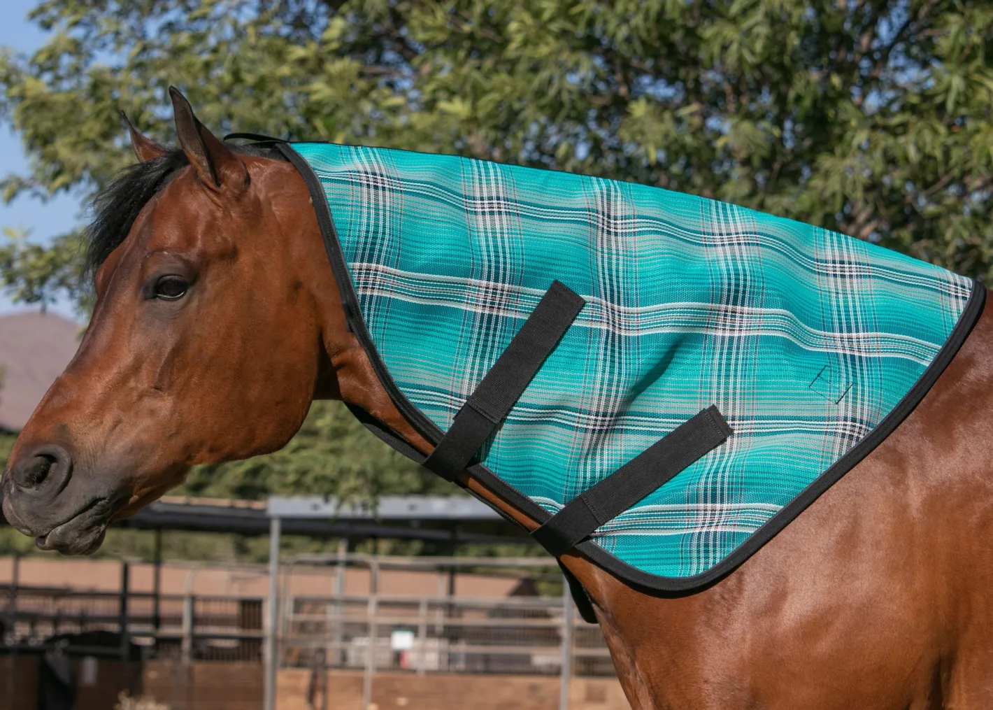 Designed to attach to the Kensington™ Surefit Textilene® Protective Sheet, this Kensington Textilene Neck Cover shields your horse’s neck from poll to withers yet allows freedom of movement.