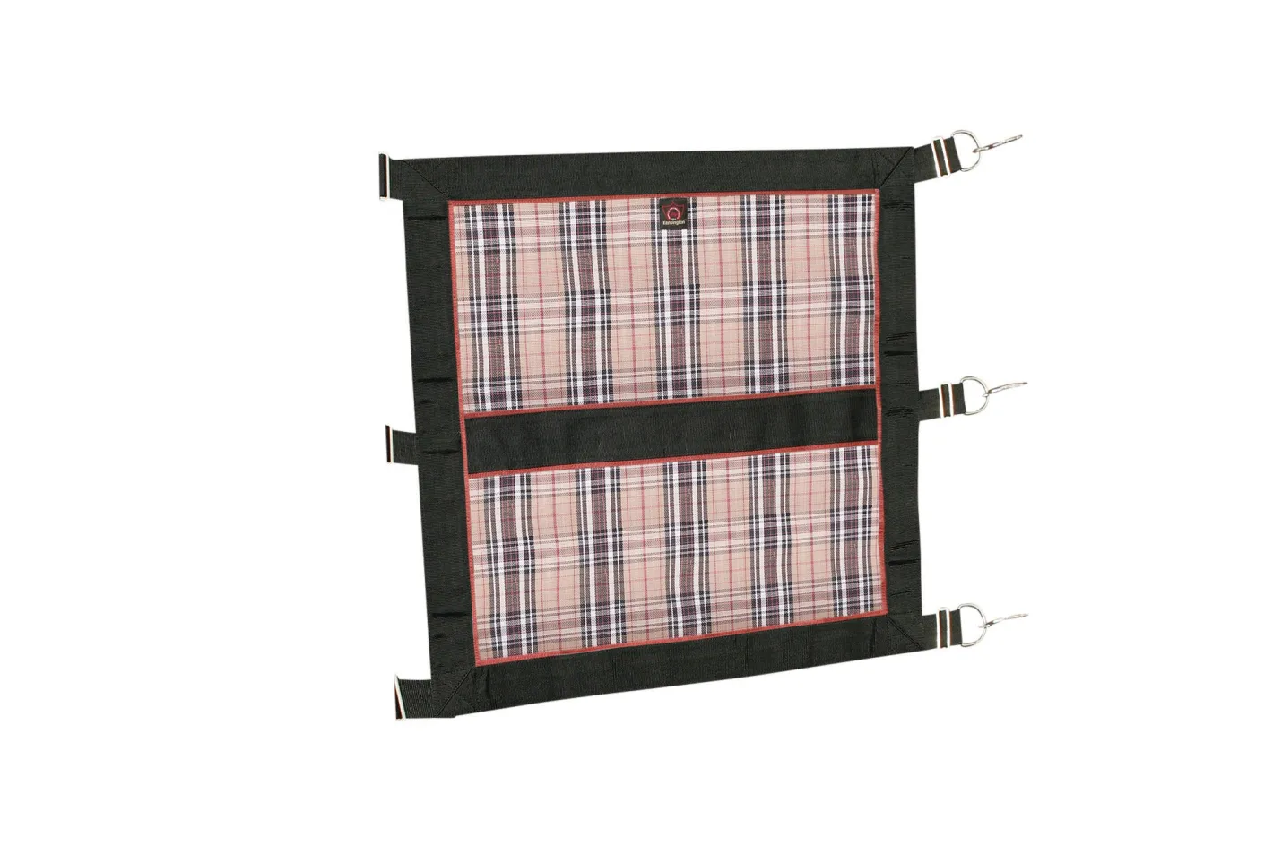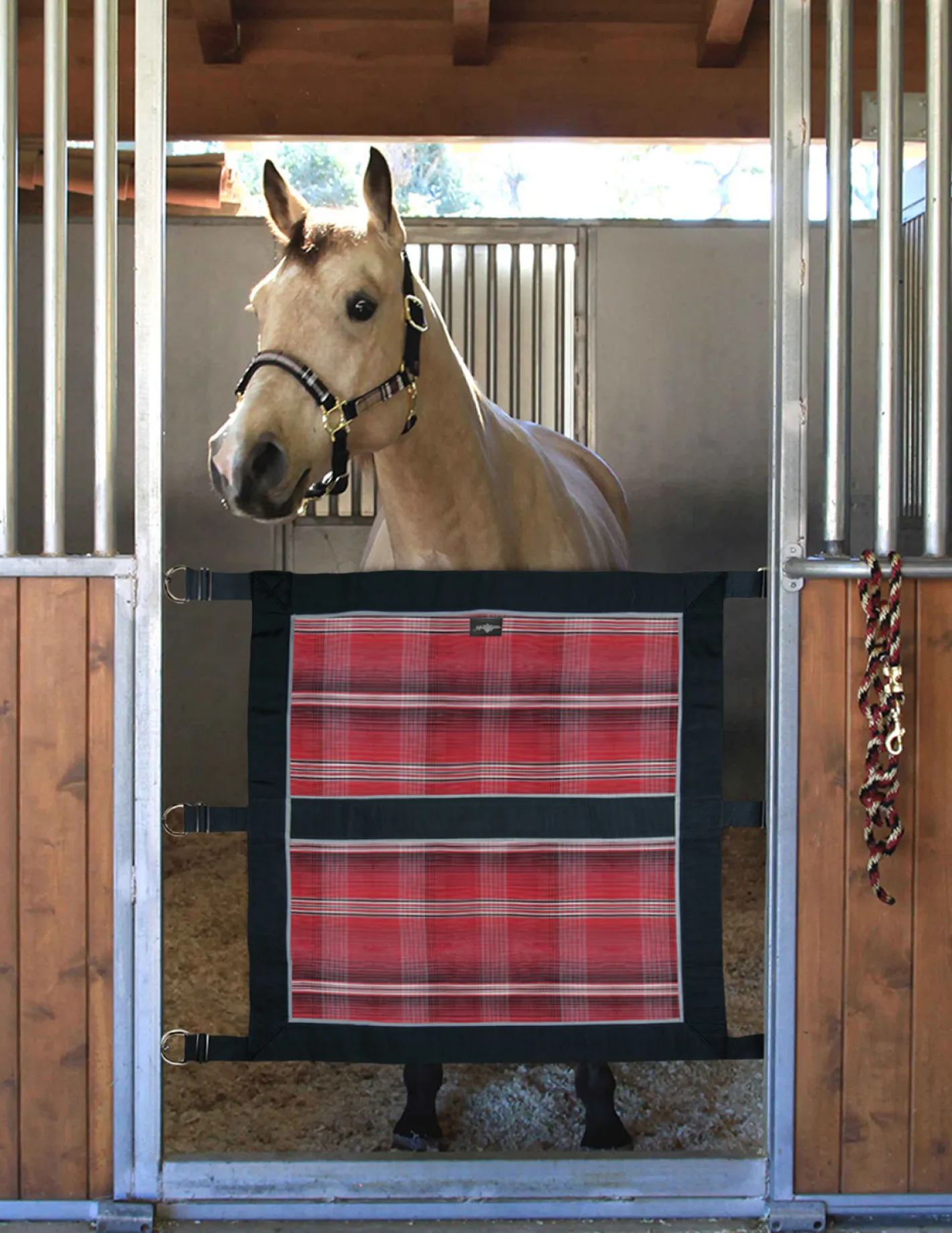 It’s made of durable, mildew-resistant Textilene® mesh reinforced with webbing. Heavy-duty brass-plated d-rings allow for easy attachment to the stall door frame.