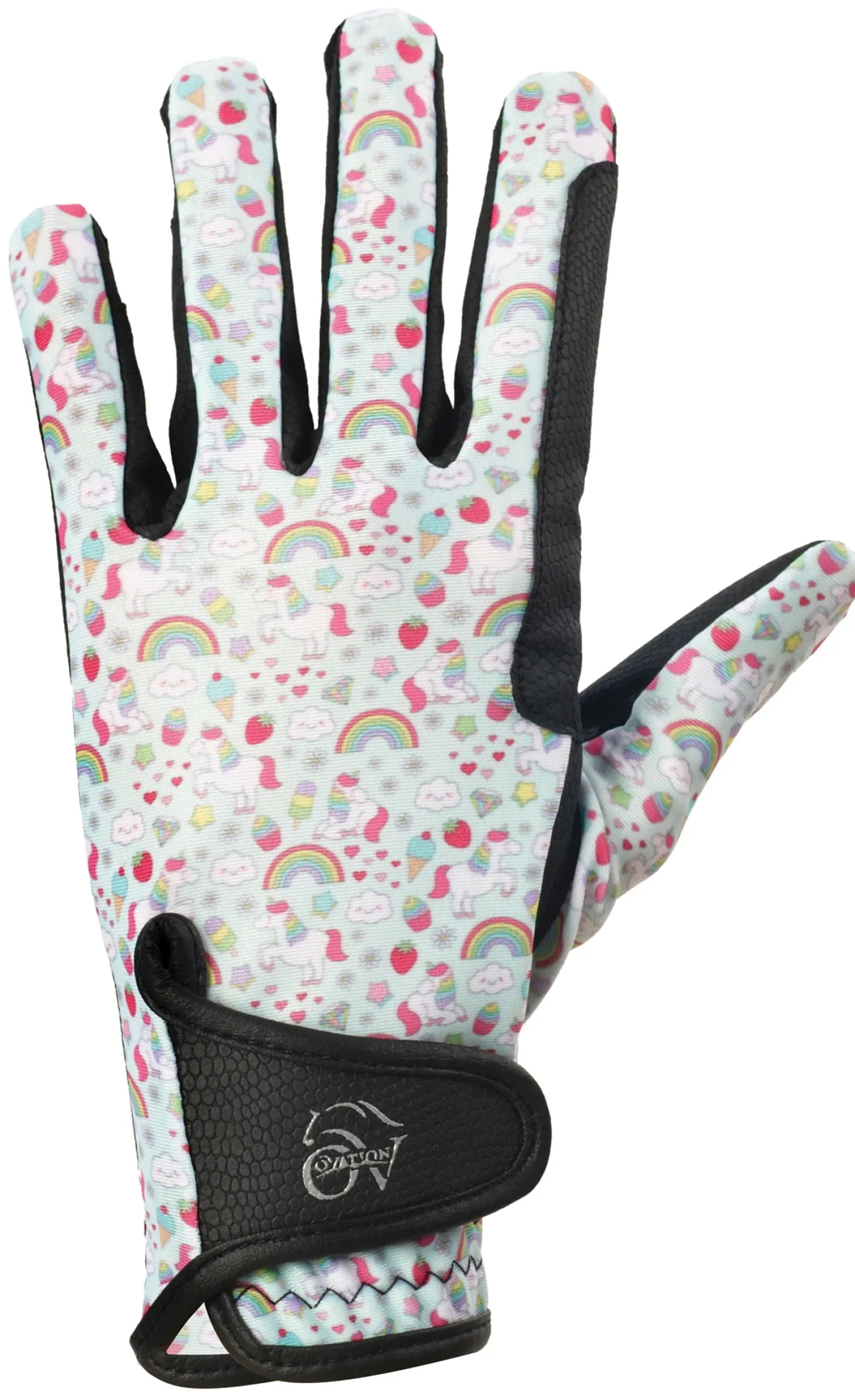 Fun prints and ultimate comfort! Ovation® Performerz™ Child’s Gloves feature a fun printed spandex back. Ultra grippy KT Serino™ synthetic palm ensures they can easily hang onto their reins. Hook-and-loop wrist closure allows for an ideal fit and fun prints are sure to be loved!