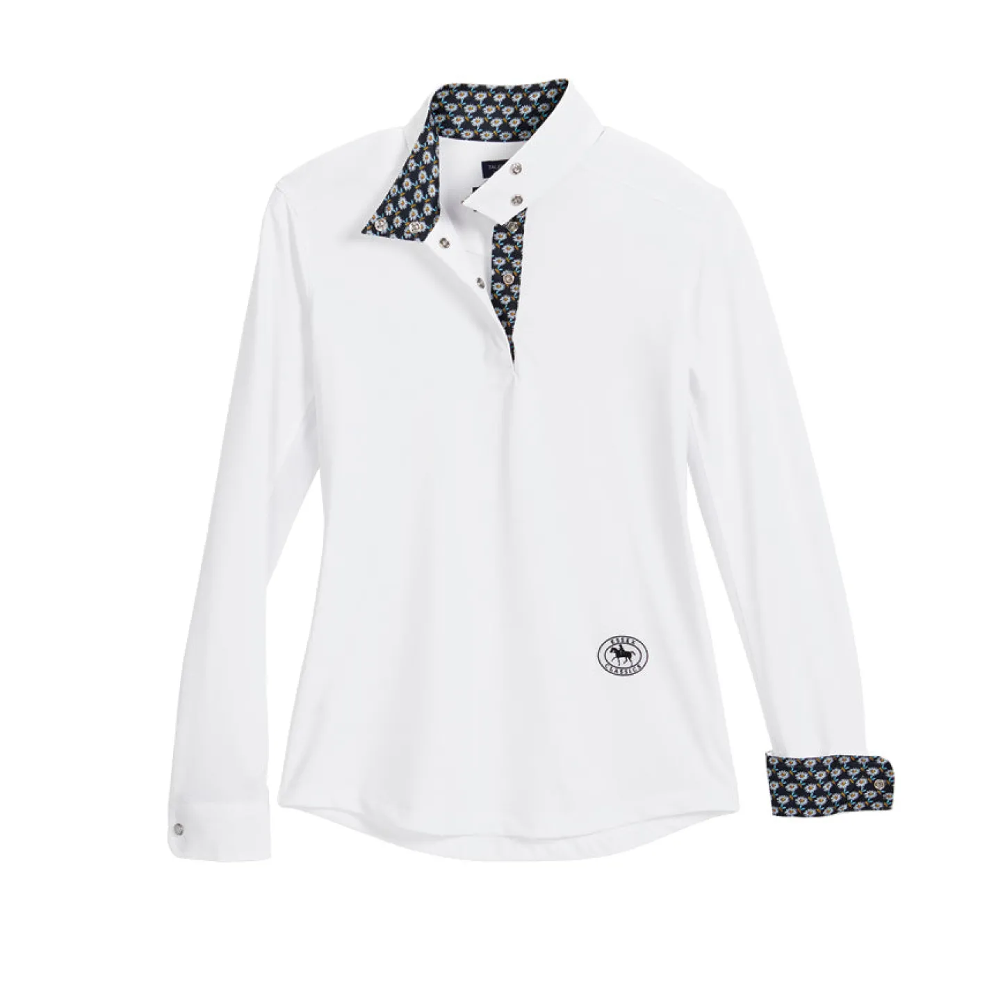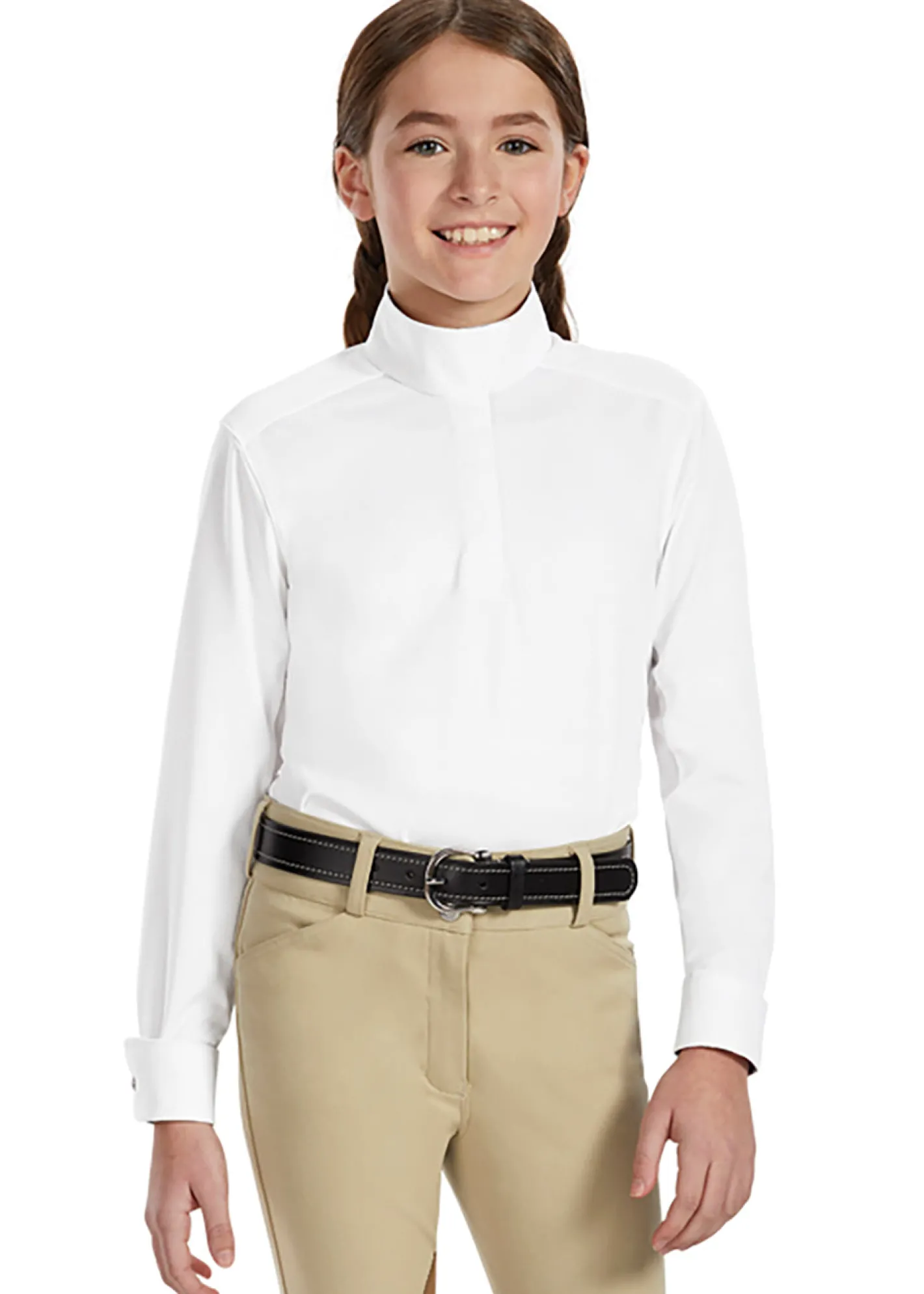 The Essex Classics Girls’ Talent Yarn® Long Sleeve Show Shirt gives the young rider polish, comfort and athletic styling in refreshing nano-tech performance fabric. The soft and stretchy fine knit helps protect skin from the sun, and thermoregulating properties help keep the rider cool. Mesh ventilation panels under the sleeves boost cooling. Antibacterial and deodorizing elements along with Scotchgard™ stain resistance makes it easy-care.