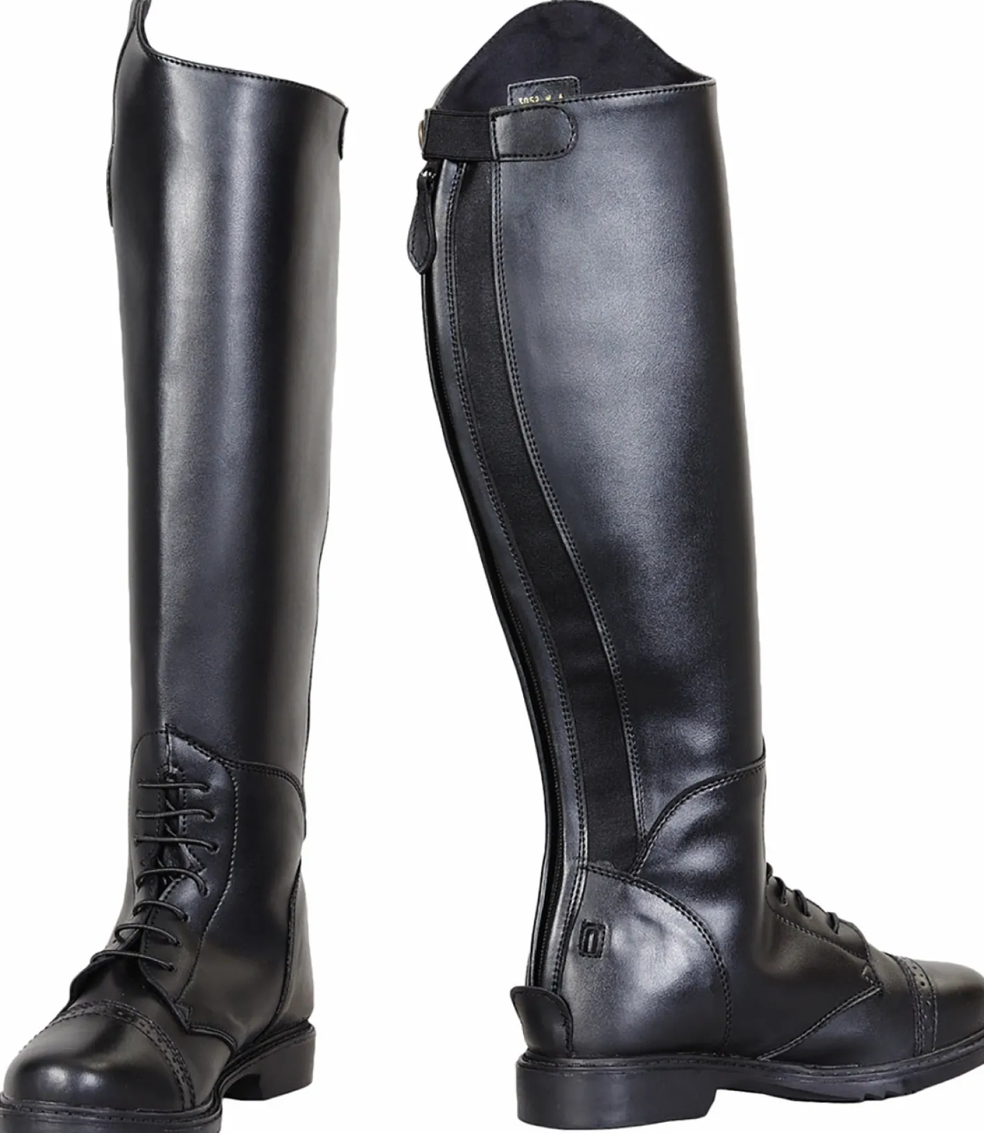 TuffRider® Children’s Starter Back-Zip Field Boots in black, water-resistant, synthetic leather look and feel like genuine leather. Perfect for everyday riding, schooling or showing, these tall boots have traditional features such as a Spanish top, contoured ankle and fixed elastic laces.