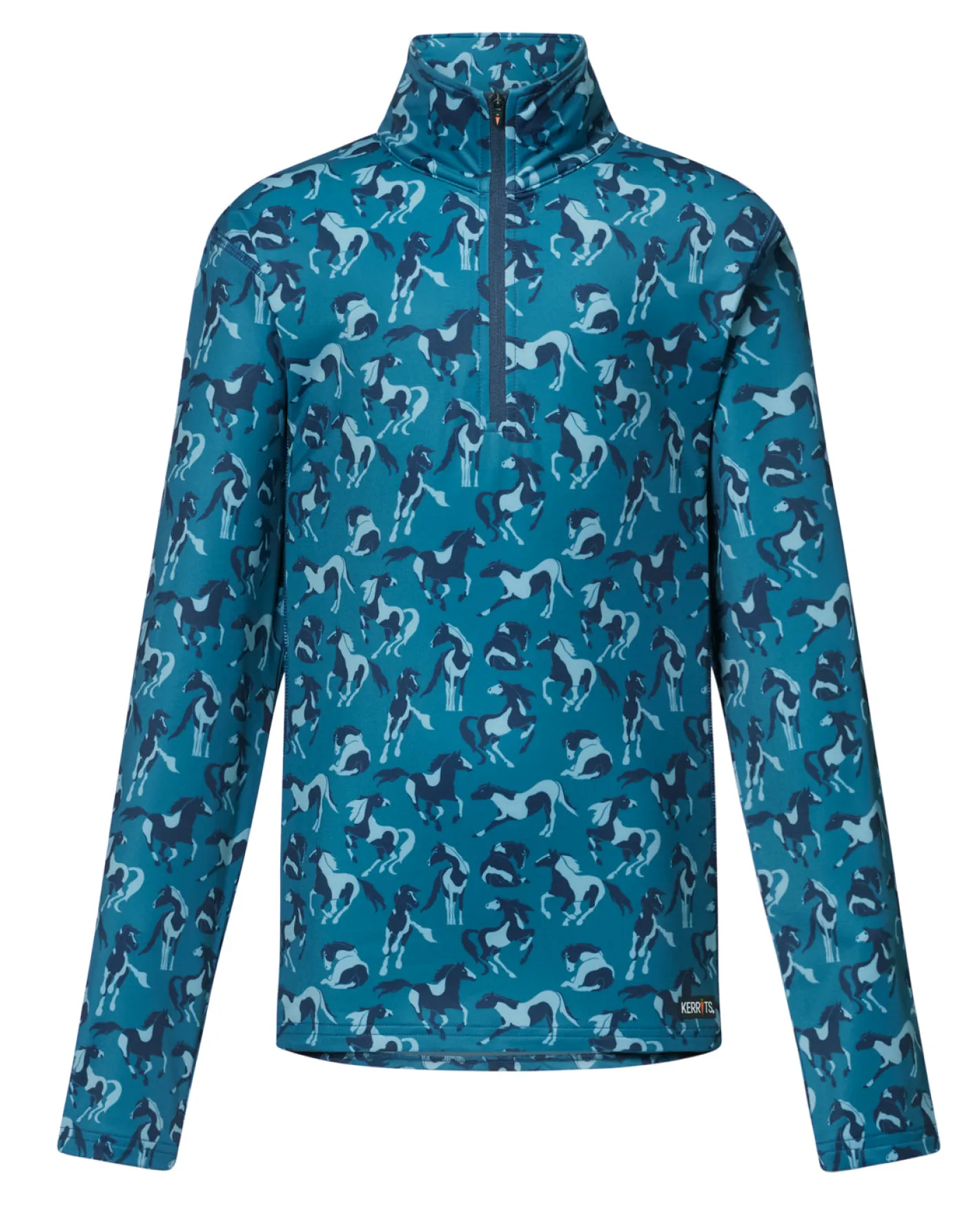 Kerrits® Kids’ On Course Quarter-Zip Fleece Tech Top is a versatile, cozy layer in an equestrian print that matches back to Kerrits tights and breeches. This long sleeve children’s top is made of four-way stretch technical knit that is lightweight and breathable. A soft and cozy microfleece interior wicks moisture. The smooth exterior sheds horsehair and hay and slips easily under a jacket. Quarter-zip placket provides adjustable ventilation.