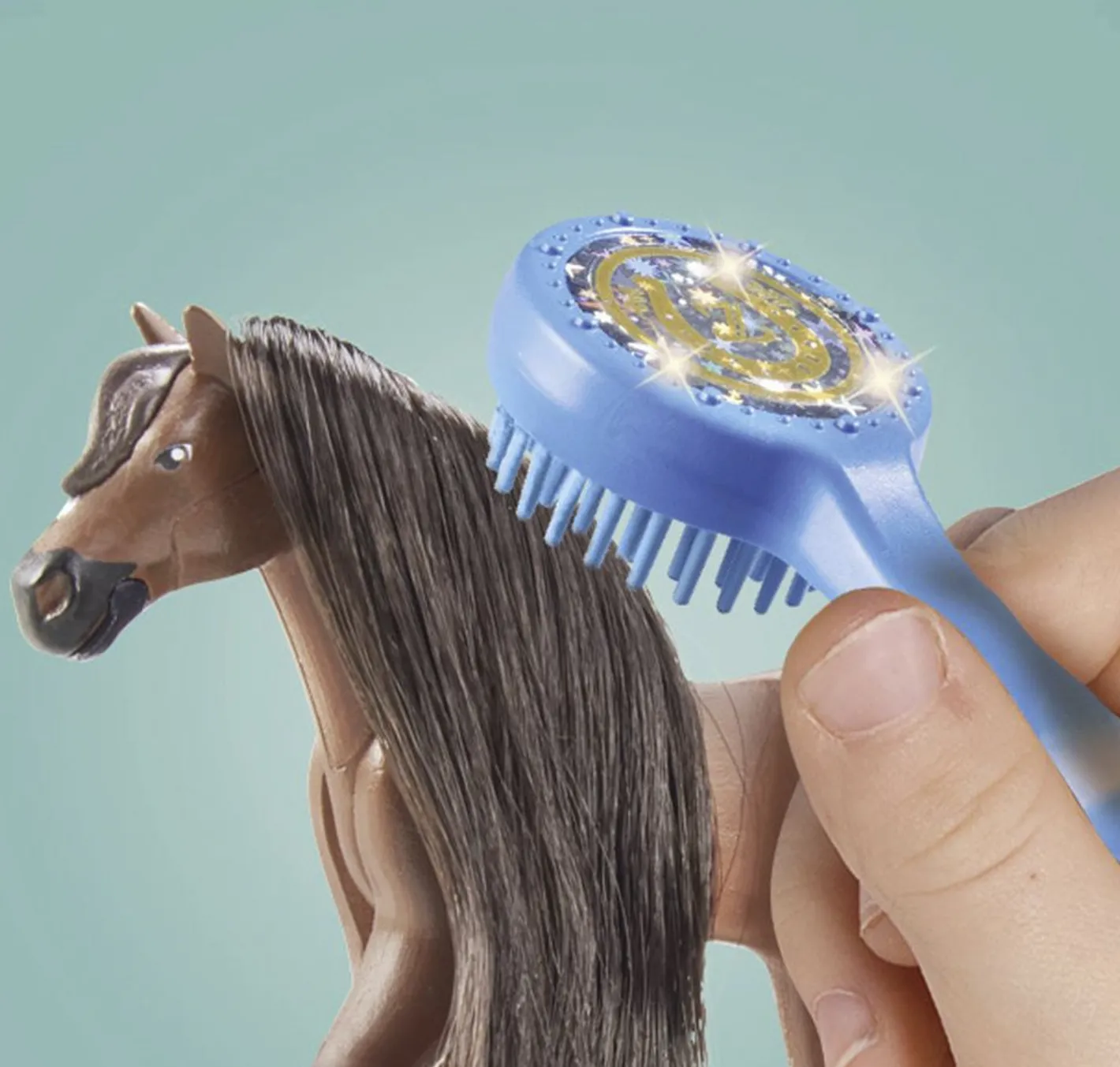 Playmobil® Zoe & Blaze go on endless adventures—and your child can go right along! This play set lets Zoe groom her Trakehner gelding, Blaze, to get ready for competition. Blaze has a long, flowing mane and tail that can be combed and styled over and again.