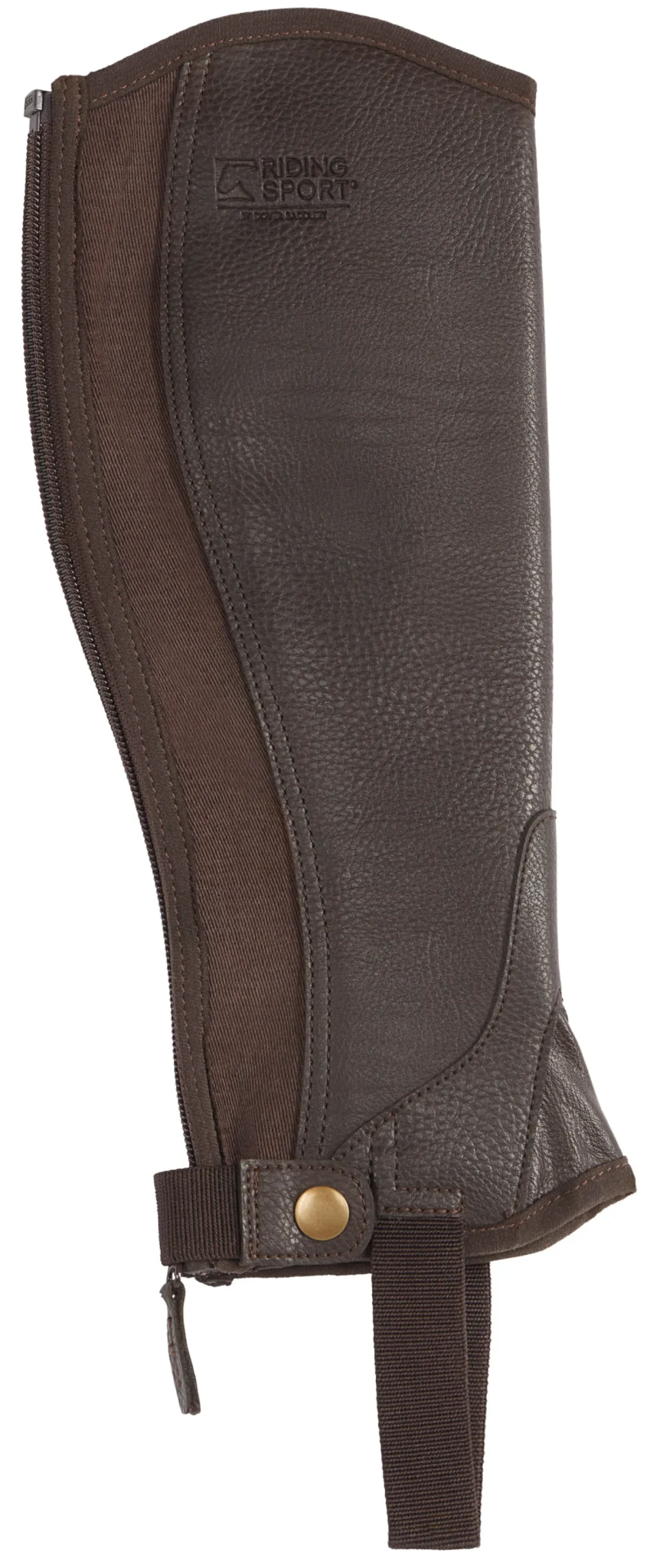 Constructed with a stretch back panel for a comfortable, easy fit, it has a rear zipper that closes from top to bottom. A zip keeper at the ankle keeps the half chap snug to your leg and secures the zipper pull. The under-boot strap is made to last from heavy-duty elastic.
