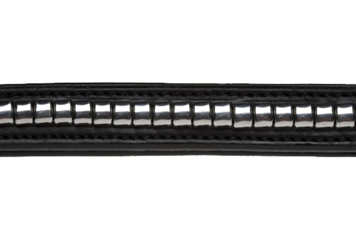 Classic silver-colored clinchers on the padded browband add a touch of flair. Features chrome fittings, buckle ends and includes a set of 3/4″ wide web reins with hand stops and buckle ends. Black.
