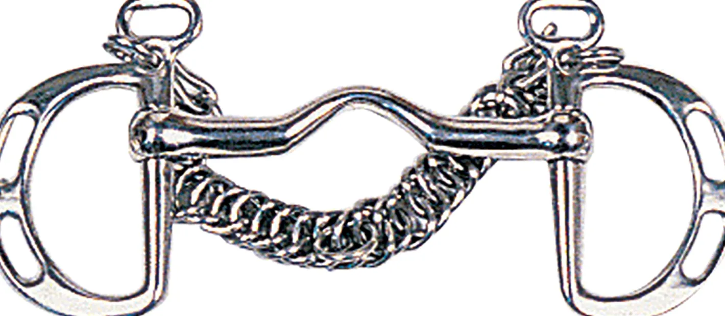 The Suffolk™ Uxeter Kimberwick Bit features a solid mouthpiece that has a medium port. This bit provides some leverage action. Cheeks provide slots for a choice of rein location. Made of stainless steel. Includes a curb chain and hooks.