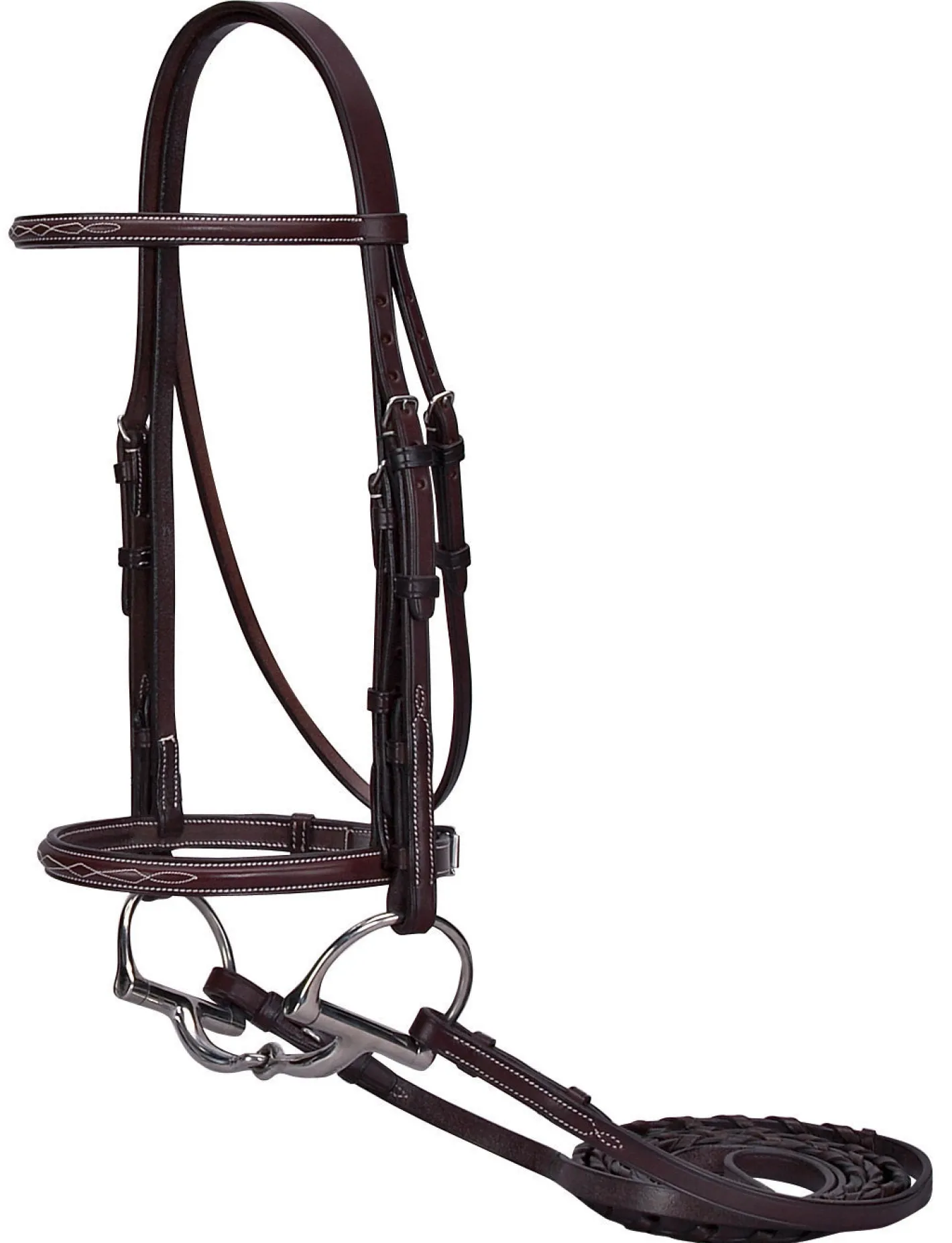 The Suffolk™ Hunter Fancy-Stitched Bridle with laced reins is attractive enough for shows and durable enough for schooling. Offering unprecedented quality at a great price, this timeless bridle comes in rich brown leather with a fancy-stitched browband and noseband. Hook stud ends.
