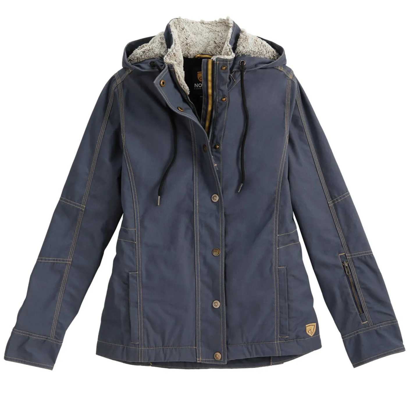 - Faux fur trim on drawstring hood and stand collar.
