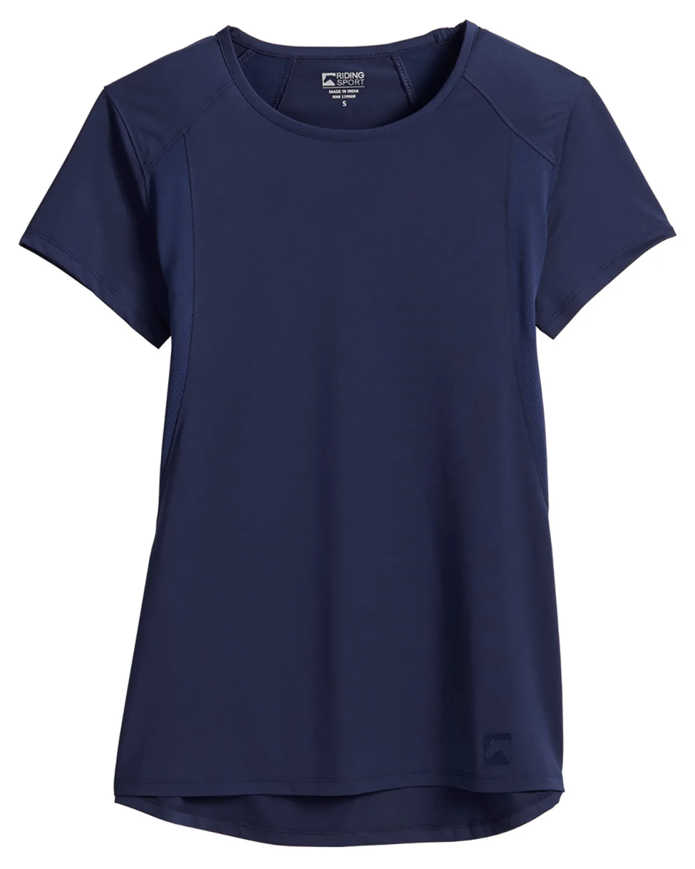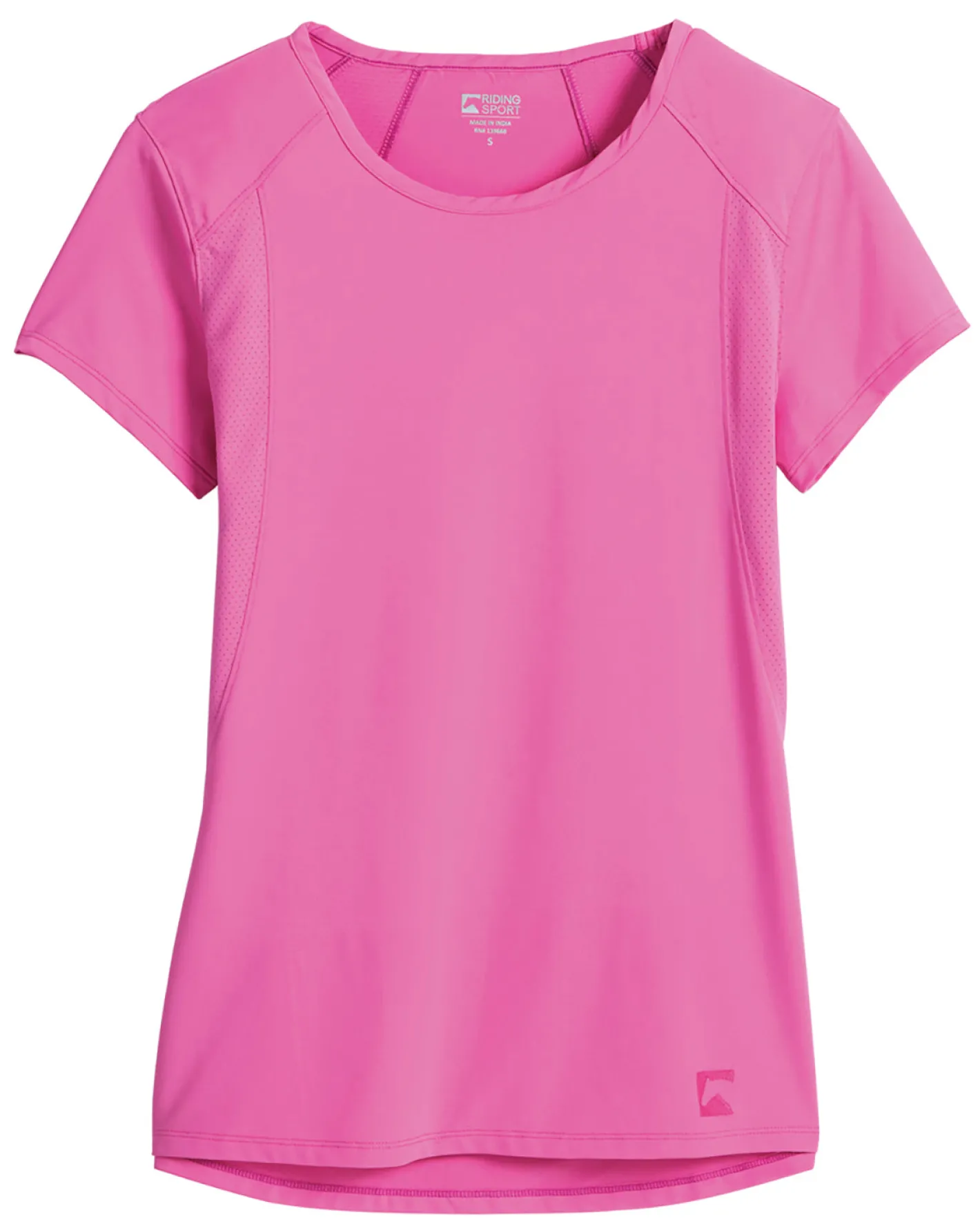 The Riding Sport™ Trisha Short Sleeve Shirt is designed to be your ideal hot-weather riding top. Extremely breathable and lightweight fabric partners with opaque mesh panels under the sleeves and through the back to maximize airflow. High stretch and raglan cap sleeve construction help to optimize your mobility. Active moisture wicking means this athletically styled shirt works to keep you dry.