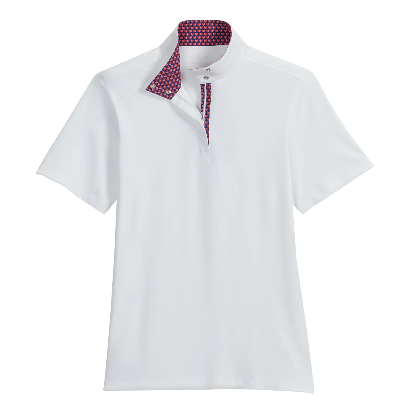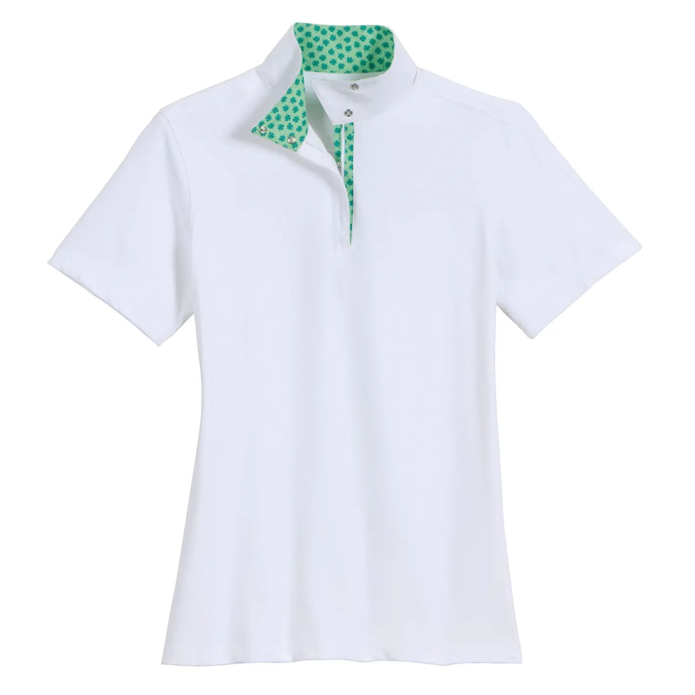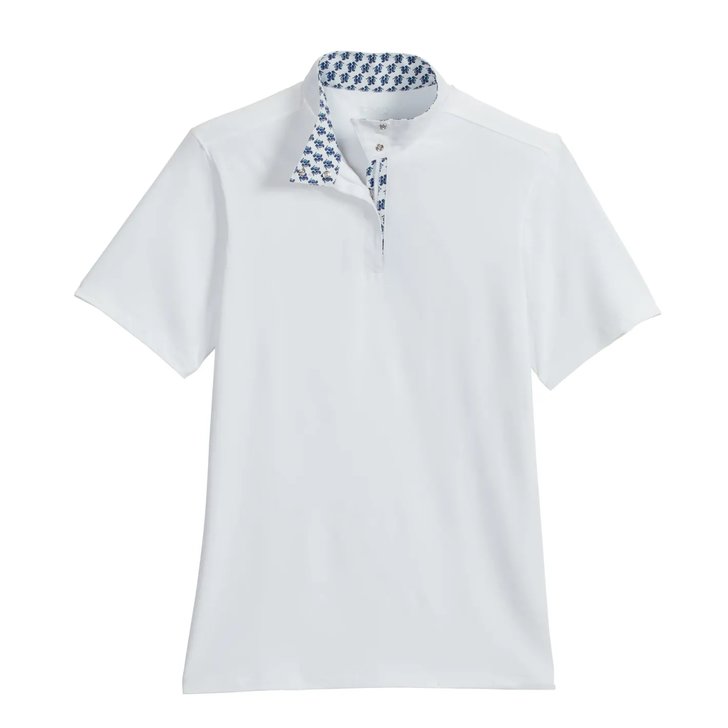 - Patterned trim inside the snap collar and placket.