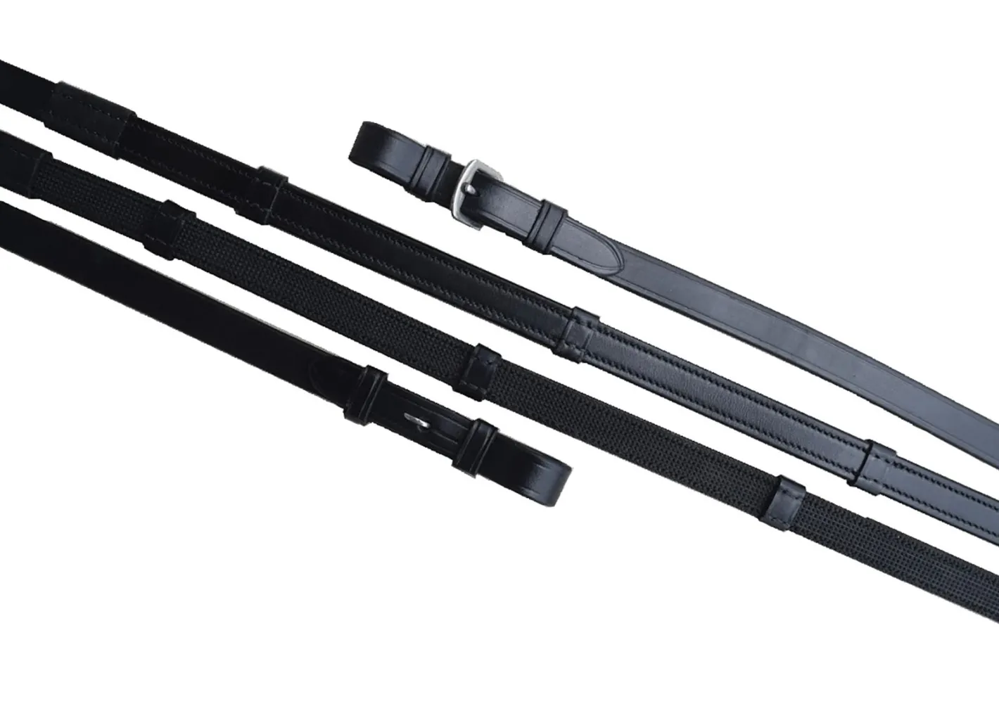 Red Barn 5/8″ x 60″ Easy Grip Snaffle Reins are made of leather with rubber on one side and hand stops for grip. Buckle ends.