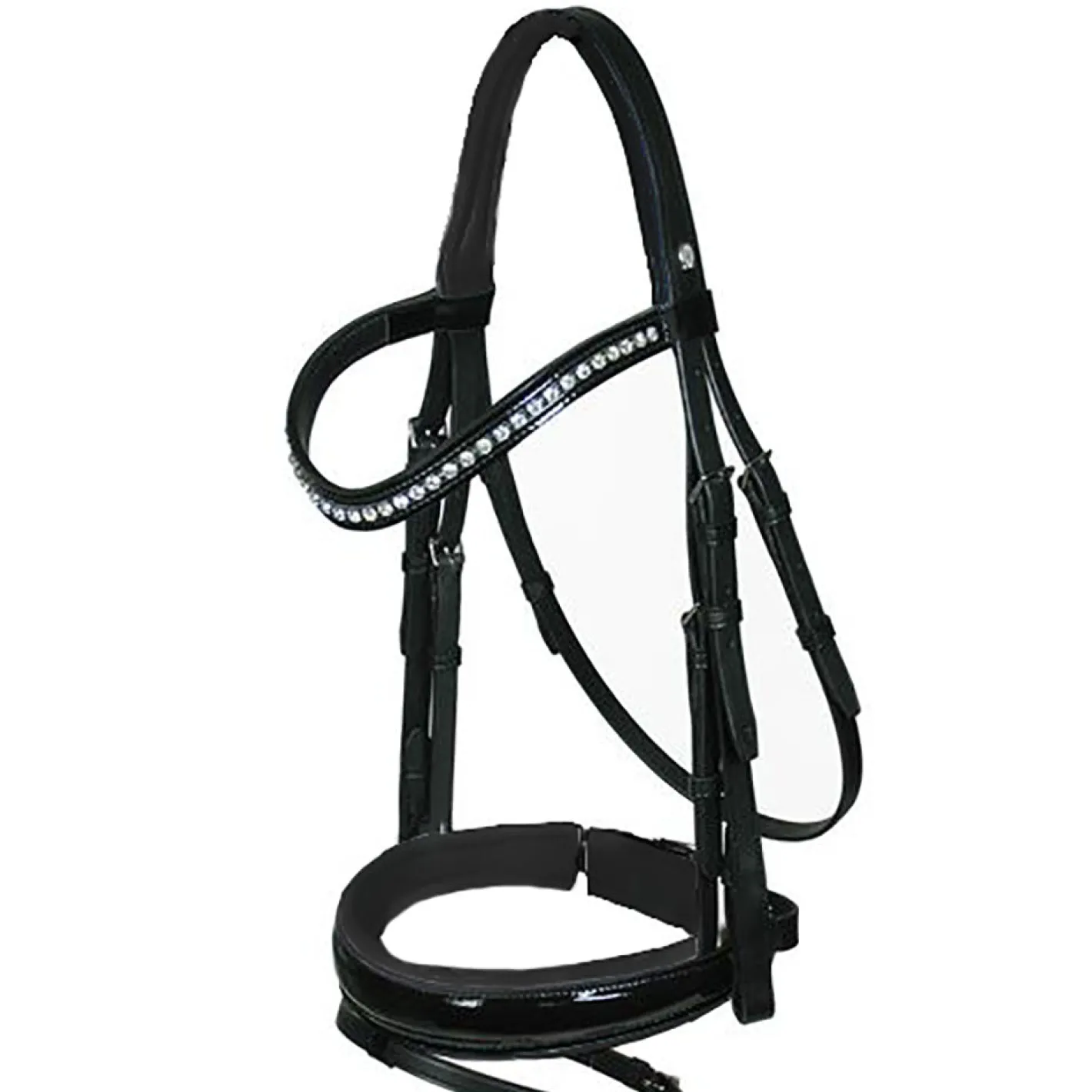 Glossy patent leather dresses up the extra-wide, well-padded 5cm crank caveson. It’s tapered at the sides to allow clearance of bit rings. Black patent leather also highlights the wave browband, which is embellished with clear Swarovski® crystals.