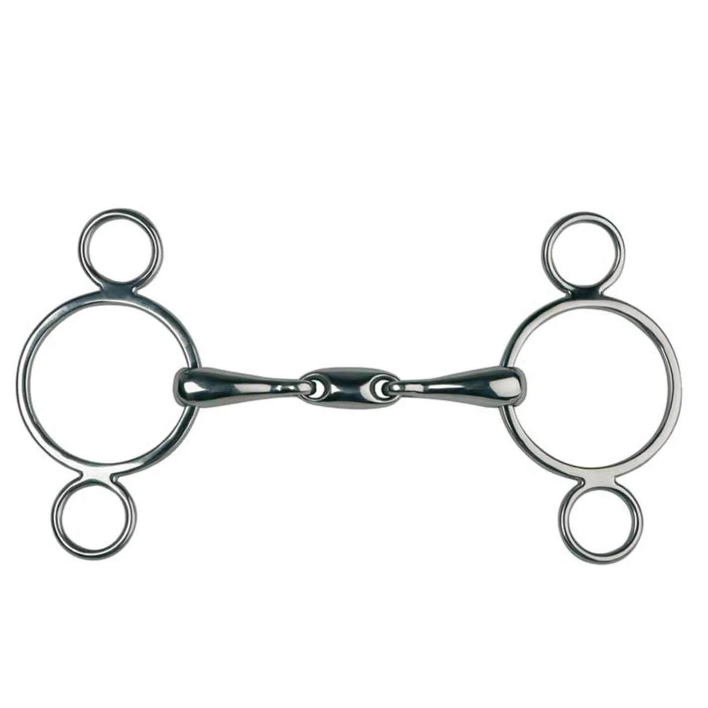The Metalab Double Jointed Continental Gag is a Level 3 bit made of stainless steel. It features an 18mm double-jointed mouthpiece with oval center link and continental gag cheeks.