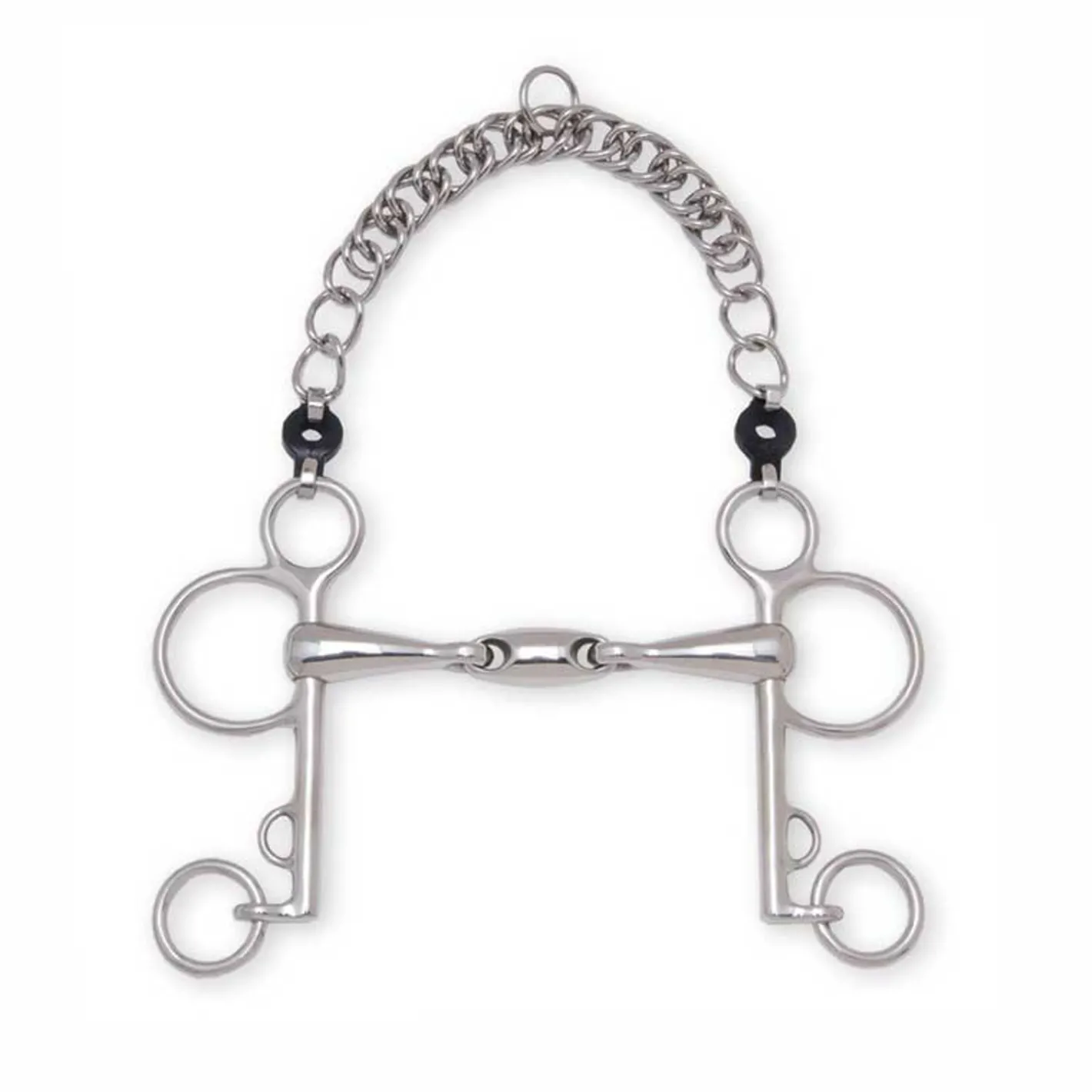The Metalab Double-Jointed with Oval Link Pelham is a Level 3 bit in stainless steel. It features a double-jointed, oval link mouthpiece with 20mm diameter. Cheeks are 5 1/4″; 1 3/4″ bottom cheek piece.