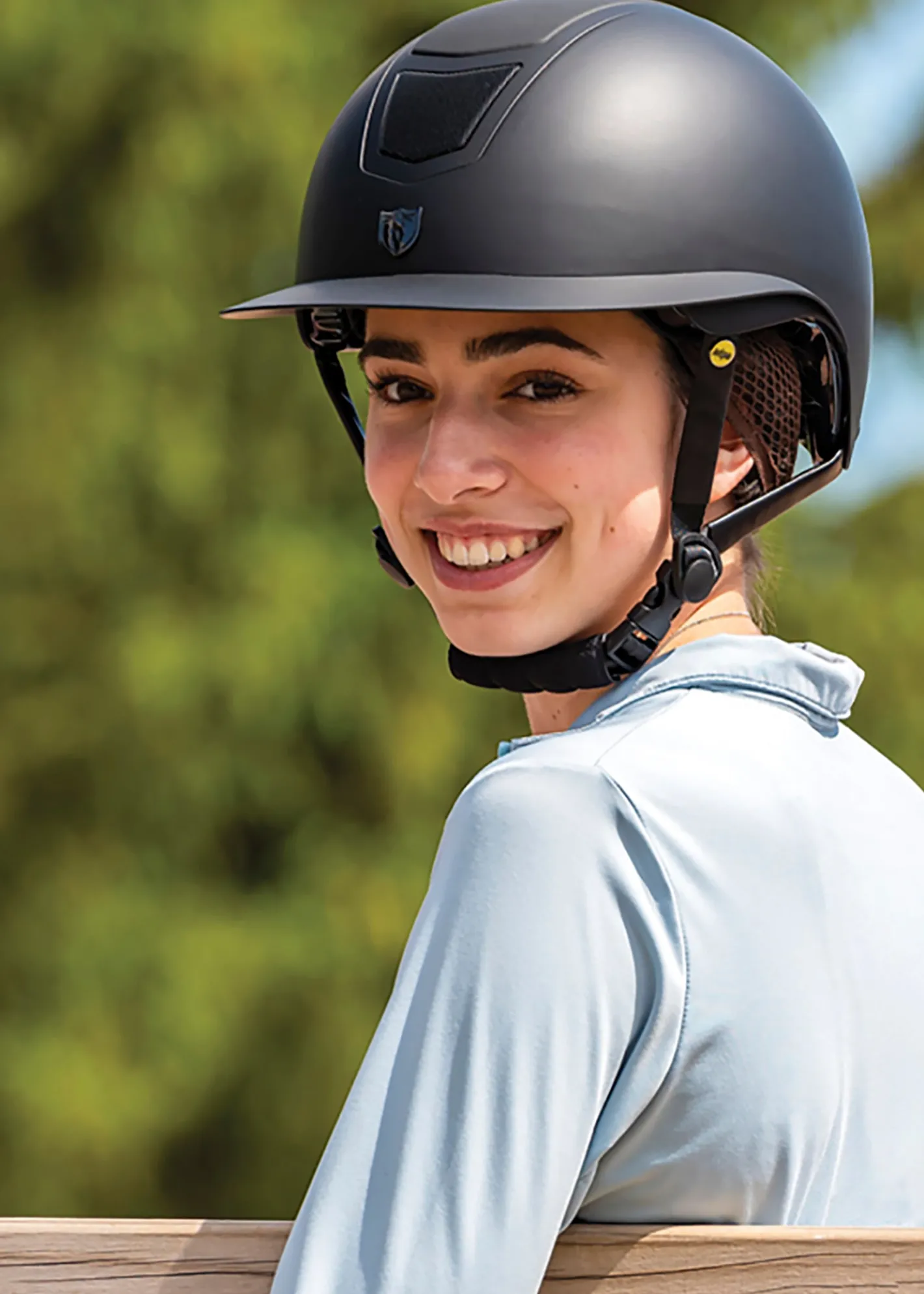 This riding helmet has an adjustable five-point synthetic leather harness with patented Duratex® buckle and includes a removable comfort chin pad. **SEI certified to ASTM F1163-23.