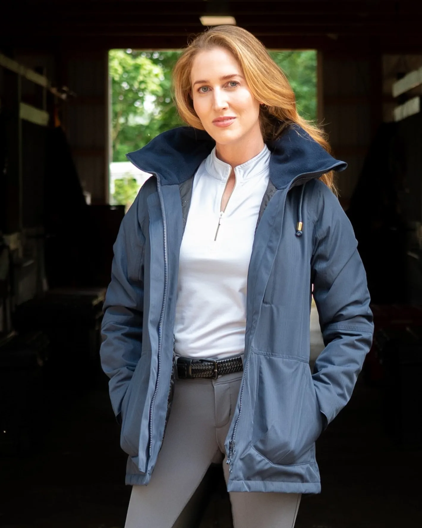 The Redingote Winter Insulated Jacket 2.0 is ready to take on winter with you! It’s lightweight, warm, durable and stylish. Breathable, waterproof shell with fully taped seams and a quilted lining with 60 grams of insulation. Favorite features include the double ended zipper that allows for hip mobility in the tack and fleece cuffs with thumbholes to keep sleeves in place and hands warm. High fleece funnel collar provides additional warmth and protection from the elements. Double-ended front zipper for adjustable fit and mobility. Oversized, adjustable hood fits over a riding helmet. Helmet visor flap flips backward and secures with a magnet to convert to a standard sized hood. Storm flap secured by magnets blocks wind and water. Secure pockets includes a horse treat pocket. Interior “backpack” straps hold the top up when you want to take the sleeves off, made of a sturdy and soft branded elastic. Sized to layer over a standard riding outfit.