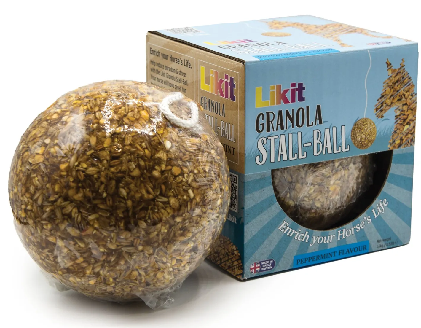 The Likit™ Granola Stall Ball is a great way to keep your horse entertained at home or away. Simply hang it from a strong rope away from any walls so it can swing freely to give your horse or pony hours of fun and boredom relief.
