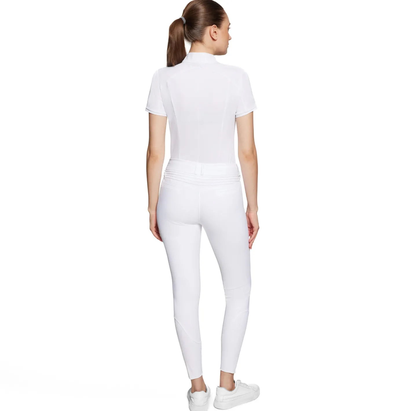 The Samshield® Ladies’ Chloe Crystal Knee-Grip Breech unites eco-conscious and wrinkle-free materials with superior styling. Breathable, compression fabric keeps you moving freely and looking your best. Mid-rise with a pleated back panel that provides a perfect fit and prevents gaping. Swarovski® crystals on front welt pockets adds style and a phone pocket with invisible zipper adds a level of security. Silicone grip knee patches provide excellent stability in the saddle. Stretch sock bottoms fit smoothly inside boots. UV 50 sun protection.