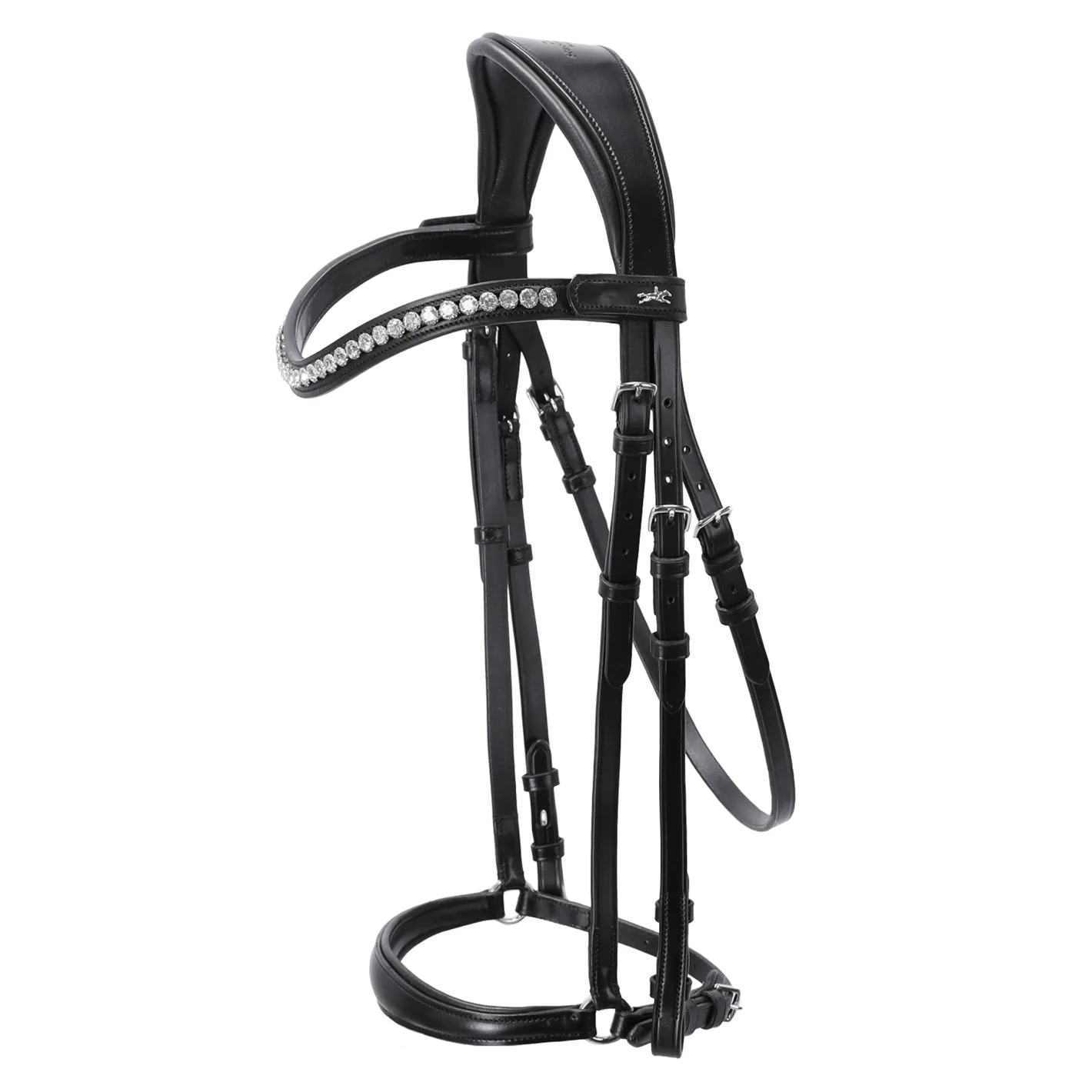 Designed with comfort and style in mind, the Schockemöhle Pisa Drop Nose Bridle has an anatomically shaped browband with large crystals that is removable with a press stud and fastener. Padded crownpiece, drop noseband and buckle. Crafted from eco-tanned leather. Single crown. Flat cheek pieces. Hook stud closure. Stainless steel fittings. Reins sold separately.