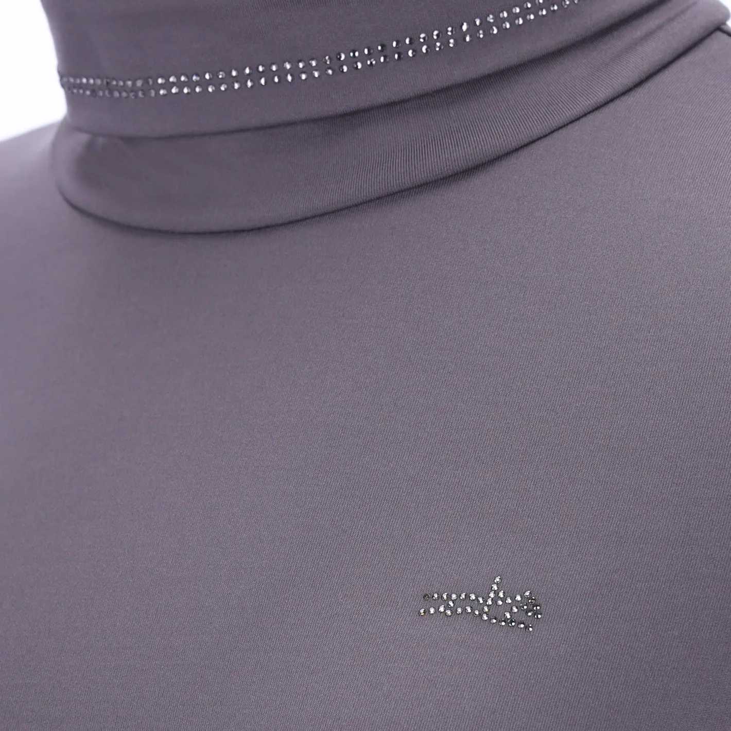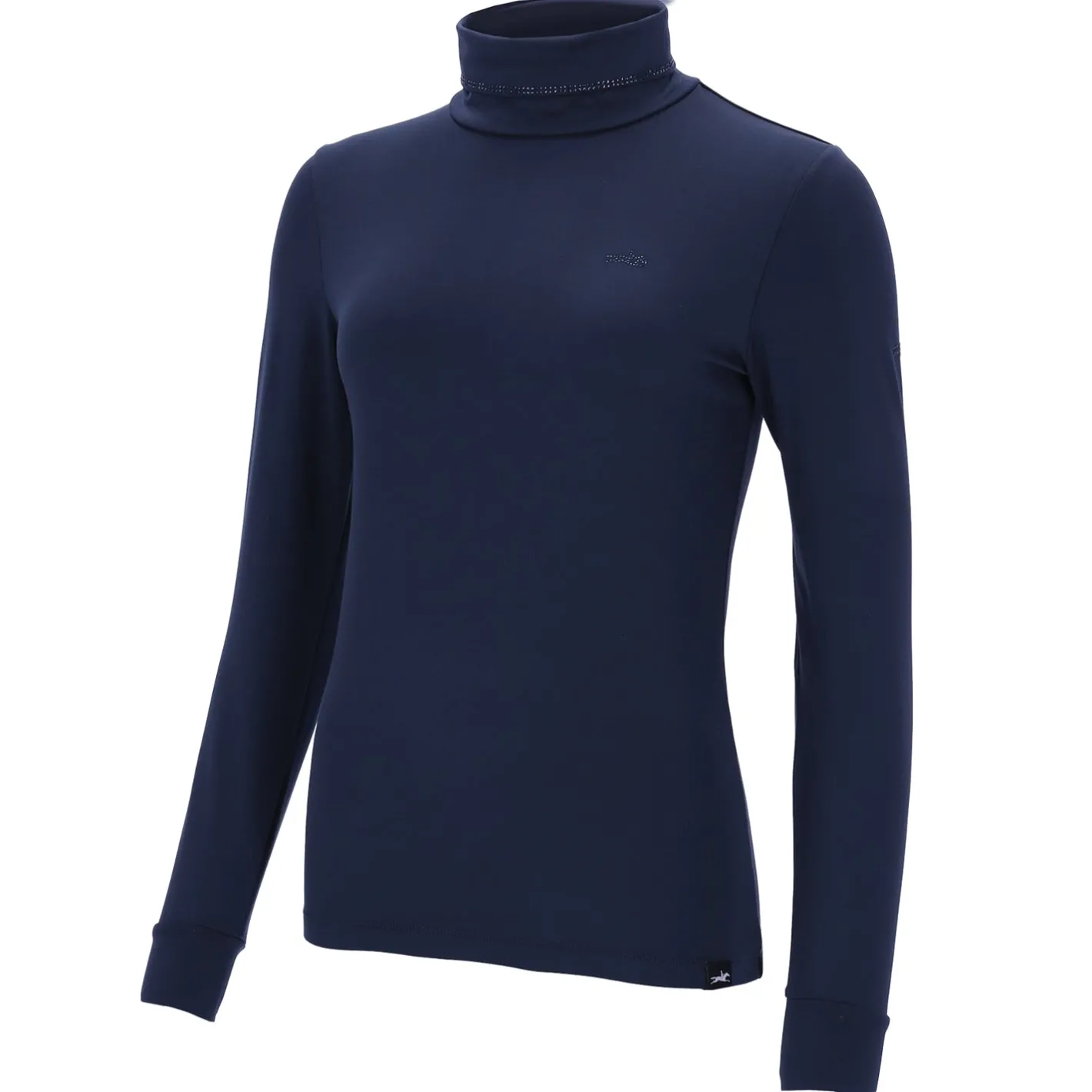In an elegant turtleneck style, the Schockemöhle SpAnne Long-Sleeve Shirt is ready to ride. Adorned with eye-catching rhinestones. Tonal rhinestone applications twinkle on the collar. Rhinestone logo motif on chest, sleeves and back.