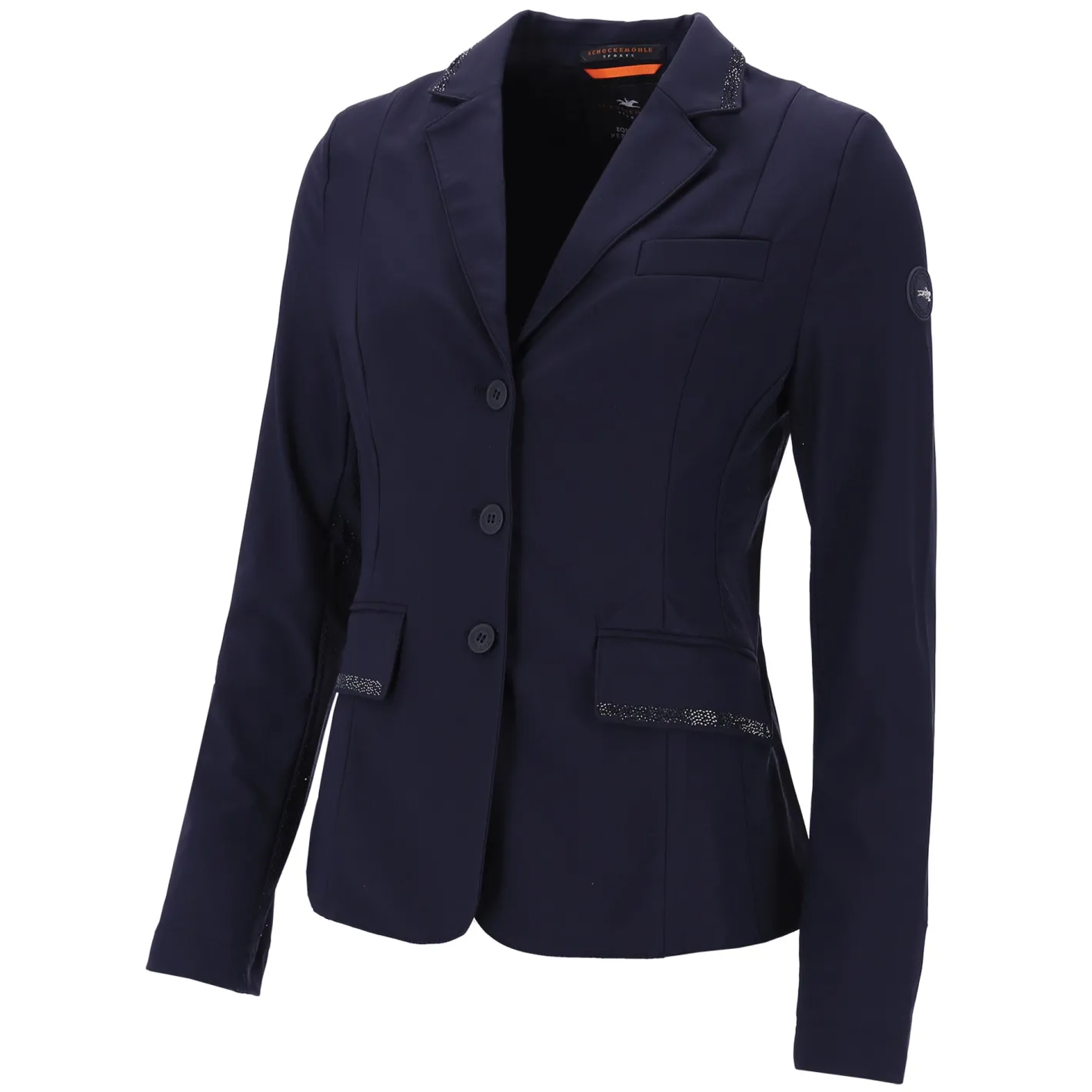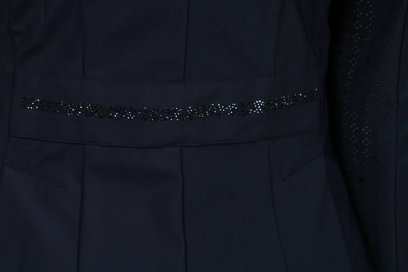 Fashionable, functional and ready to perform, the competition jacket has been elevated with the Schockemöhle Ladies’ SpAlaine Show Coat. Piped pockets with flaps and rhinestone decoration for a flattering look in the saddle, perforated side panels with dividing seams and back bar at the back. Walking slits, rhinestone decoration on the collar and back bar. Buttons and a concealed zipper close the jacket with a clean silhouette. Logo rubber badge on the sleeve announces Schockemöhle sophistication.