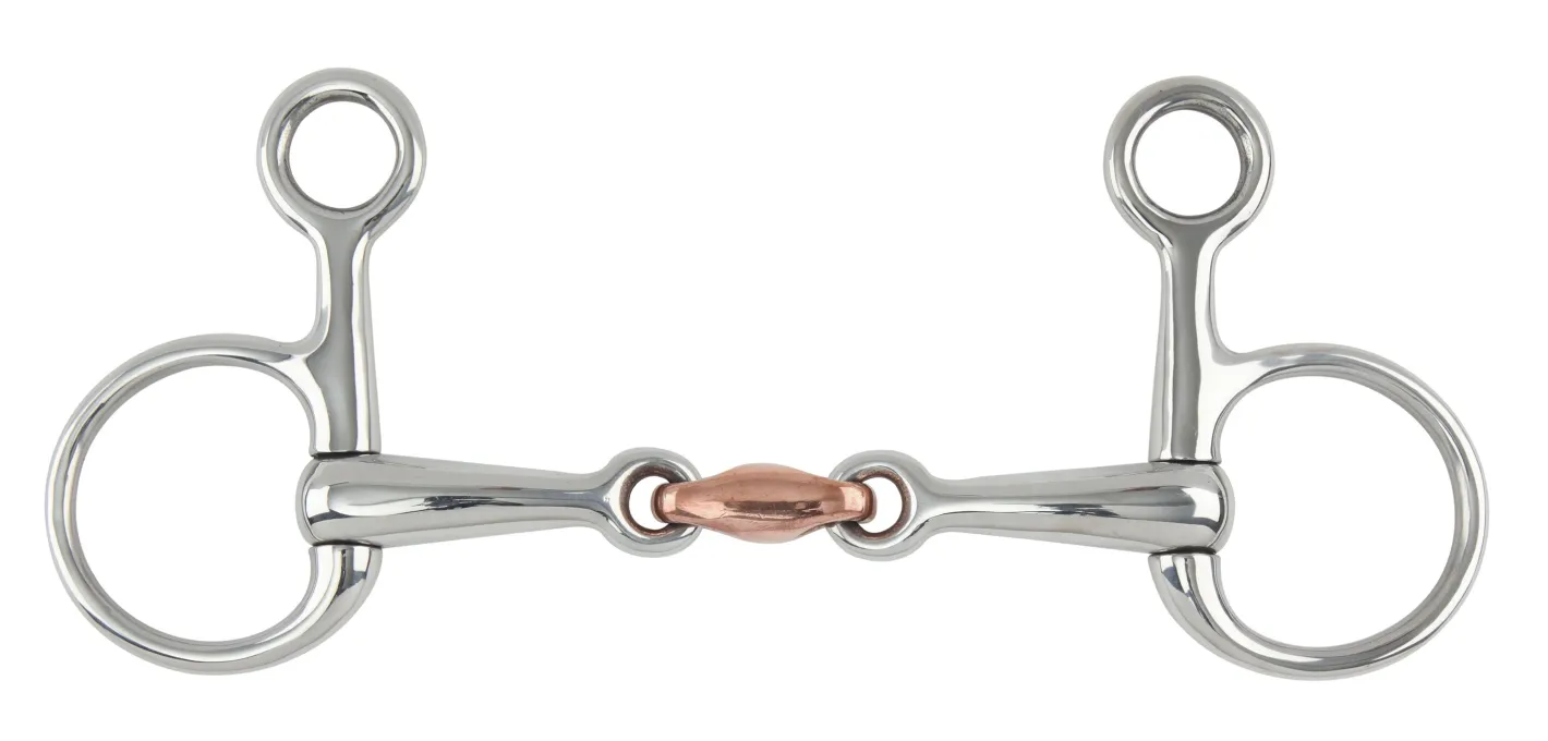 The small shank on the Hanging Cheek Bit, also known as a Baucher Bit, assists with a small amount of poll pressure. The sweet taste fo the copper lozenge assists with salvation. The lozenge mouth also prevents the nutcracker effect produced by a single joint bit.