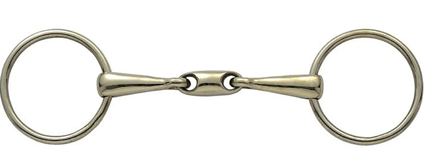This Loose Ring Copper Alloy Training Bit with 18mm mouth has an oval center link. The design helps eliminated the nutcracker action of a single-jointed bit. The gentle rounded link is also made of copper to encourage salivation. 65mm rings.