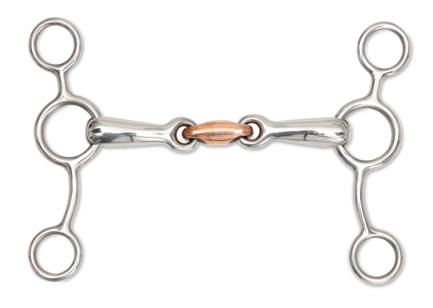 This Tom Thumb Bit with Copper Lozenge is especially good for jumping. A lifting effect at the front can help reduce leaning on the bit and enables control and precision.The mouthpiece contours the tongue and forms a true contact, enabling clearly defined aids to be given through the reins. The copper lozenge aids in salavation.